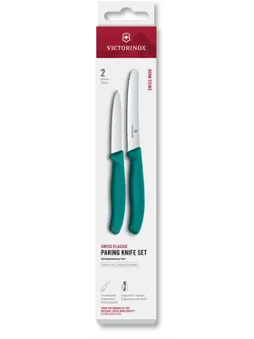 Состав комплекта В комплекте 2 ножа зеленого цвета: прямая заточка с заостренным кончиком и длиной лезвия - 8 см, столовый нож с закругленным кончиком и серрейт заточкой, длина лезвия - 11 см