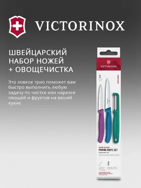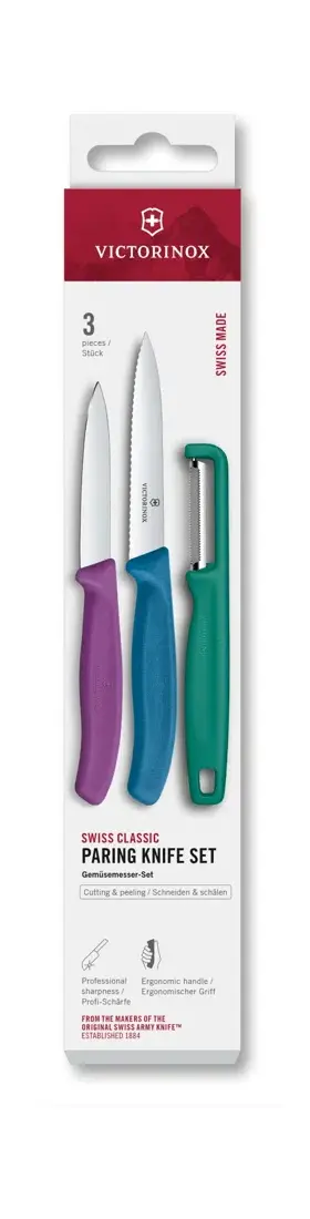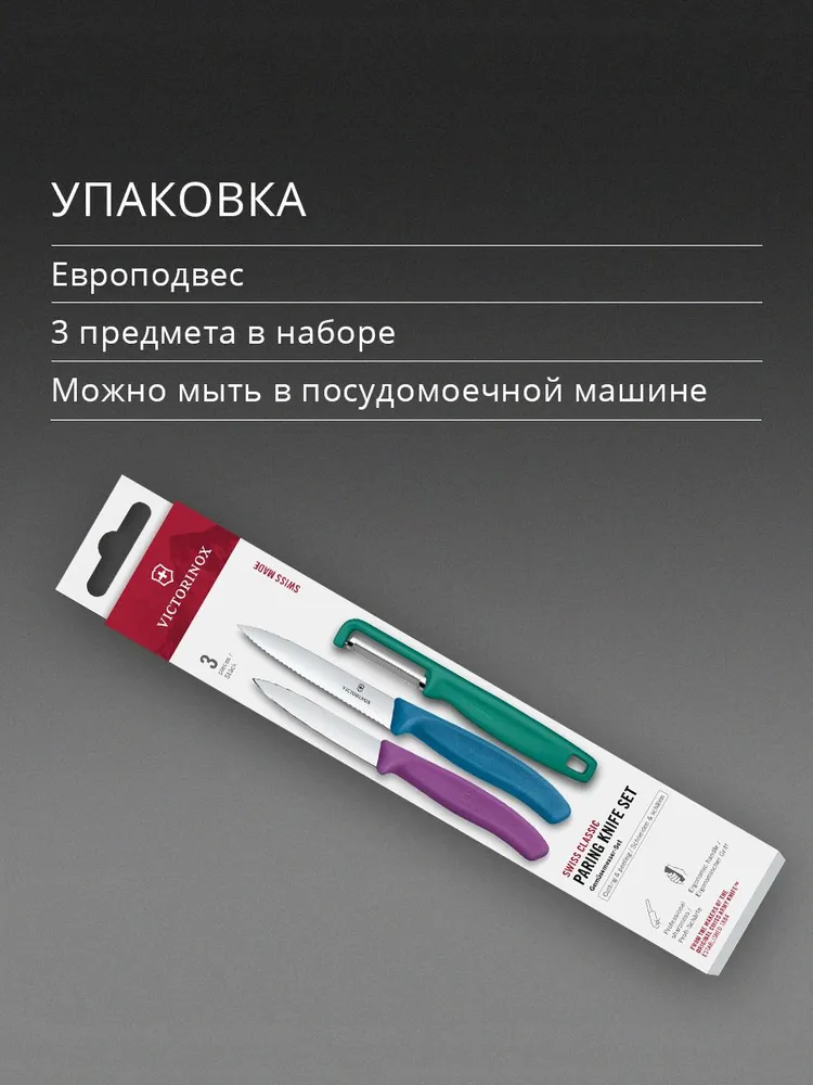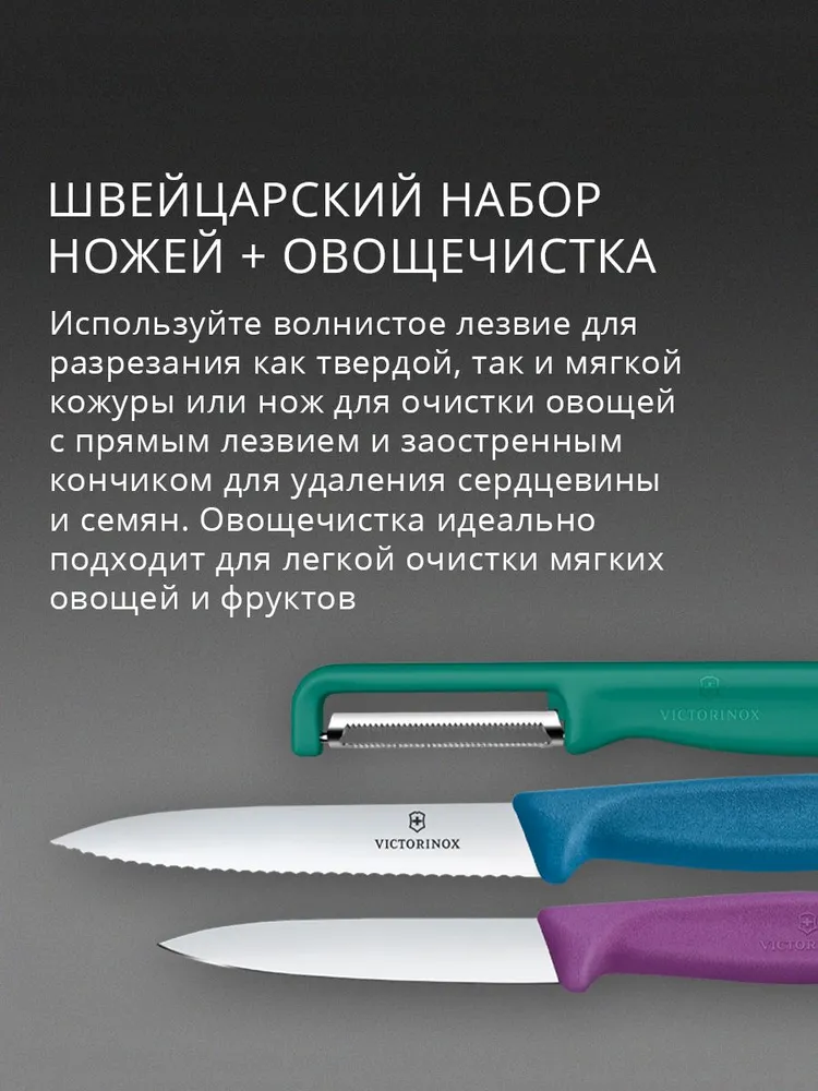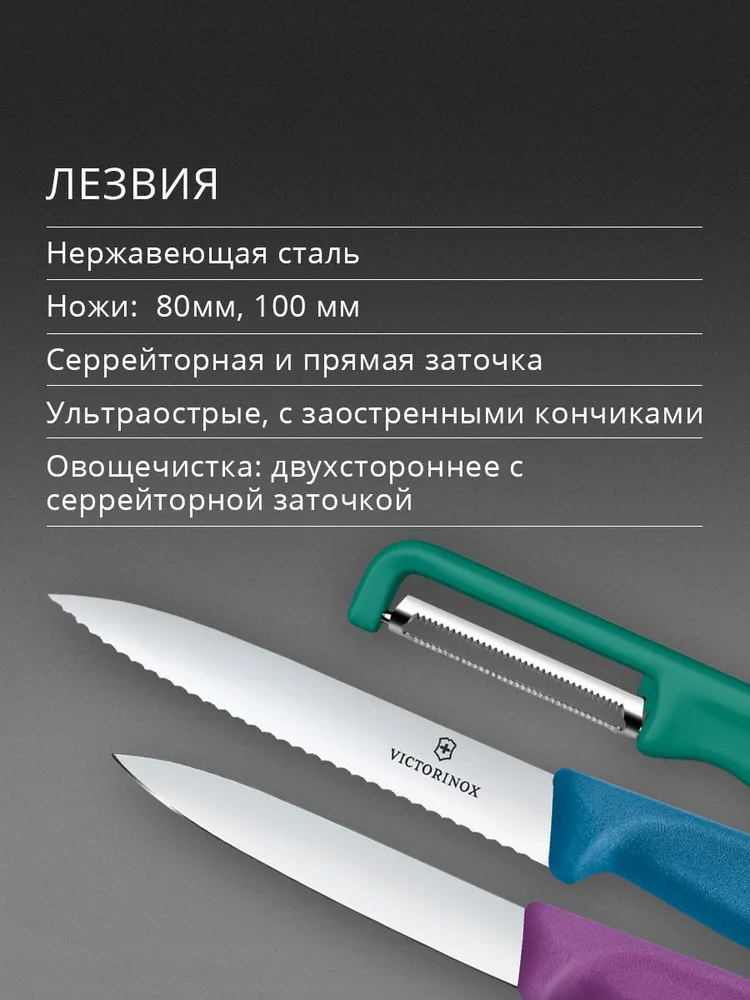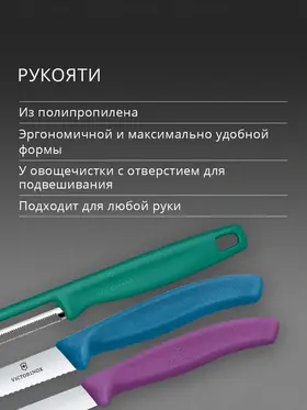 В комплекте 2 ножа фиолетового и синего цвета с прямой и серрейт заточкой, длиной лезвия 8 и 10 см, овощечистка Iota зеленого цвета c двойным лезвием и серрейт заточкой