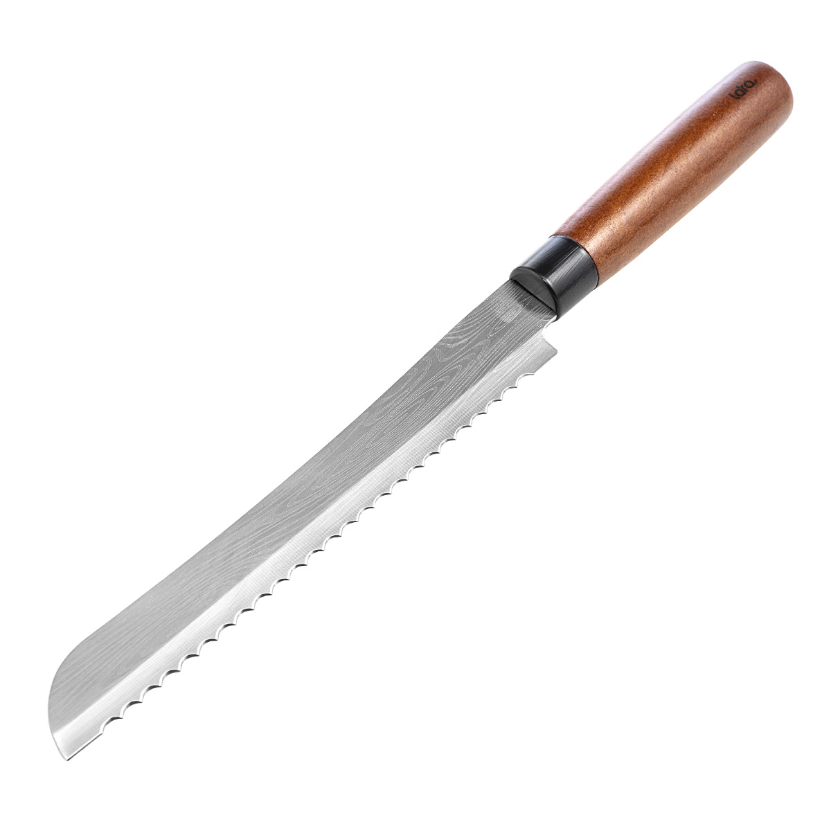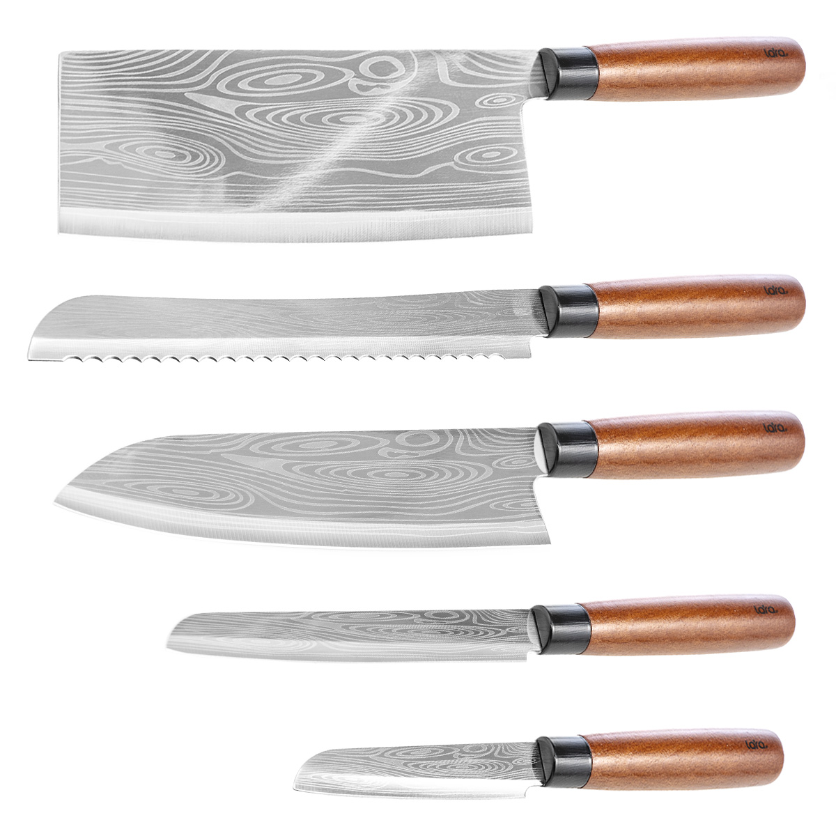 В набор входят пять предметов: нож для овощей, для хлеба, универсальный, сантоку и кухонный топорик.