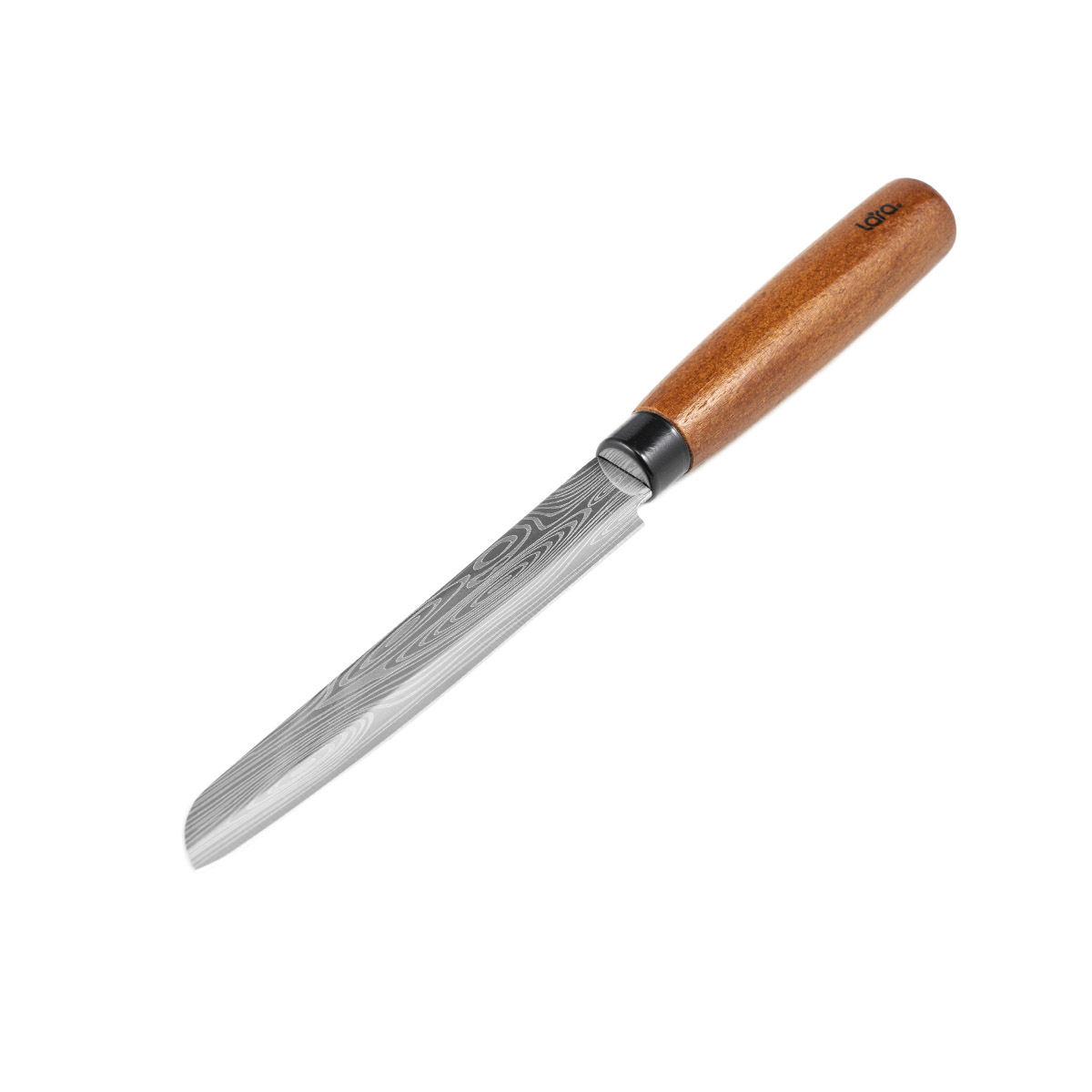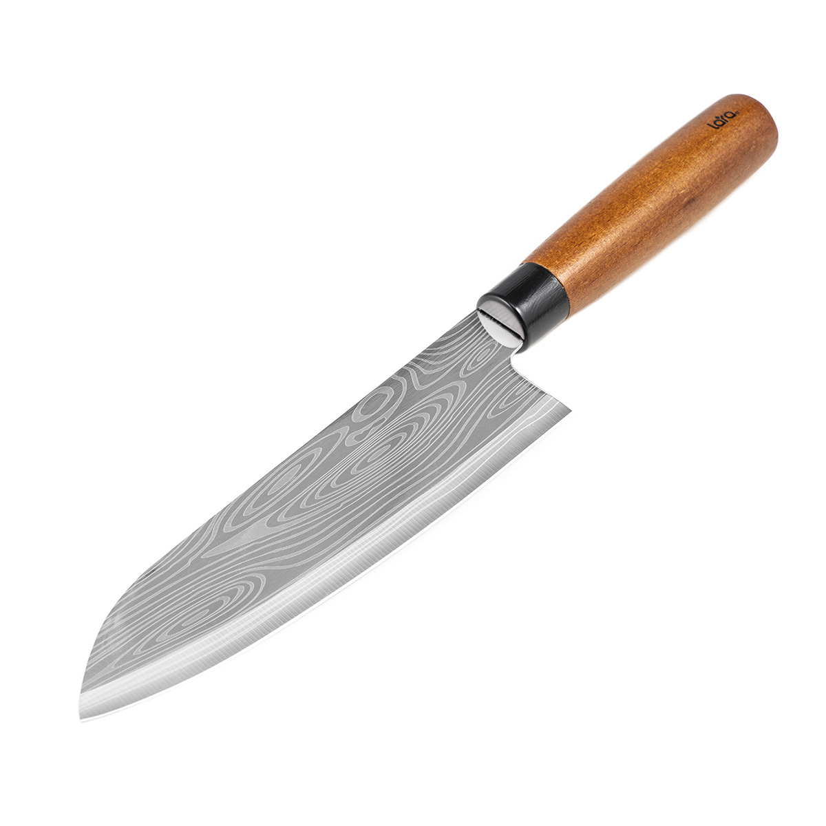 Удобная рукоять из темной древесины со стальным черным больстером придает дизайну ножа завершенный вид. Рекомендуется ручная мойка.