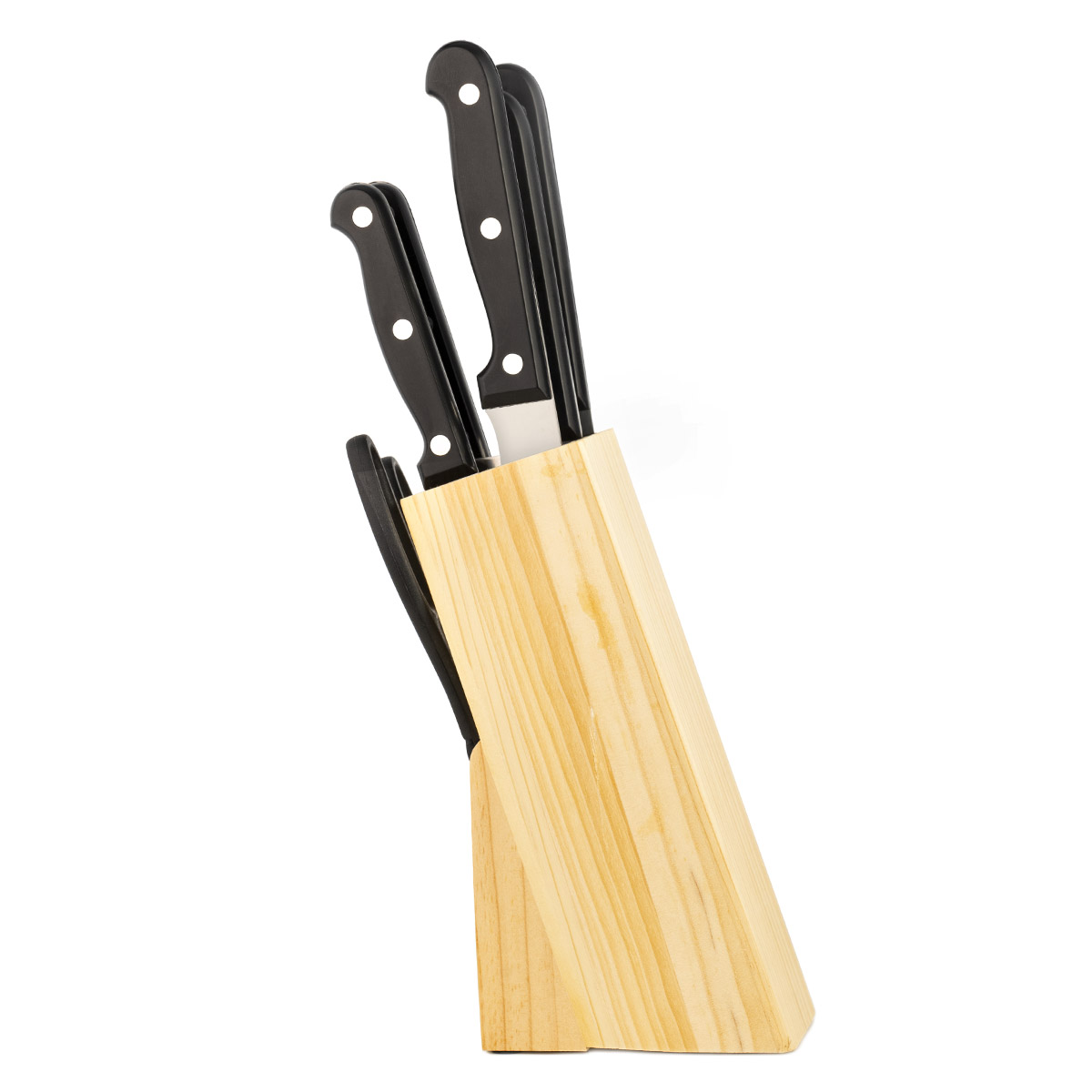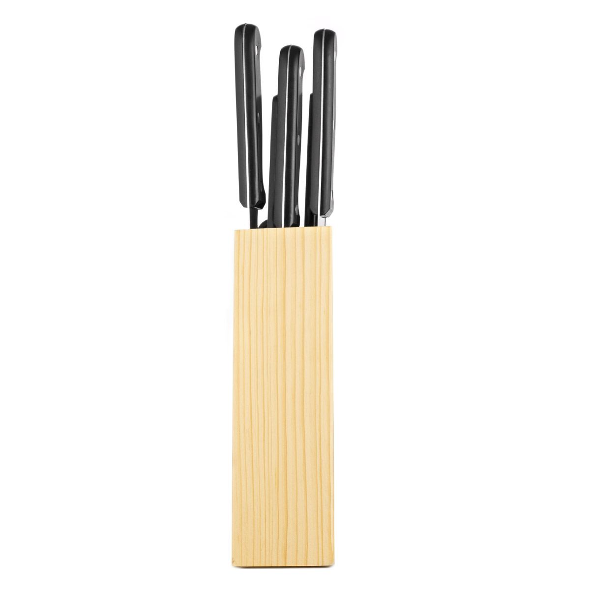 Подставка из неокрашенной древесины сосны бережно сохранит заточку лезвий и сэкономит место для хранения.