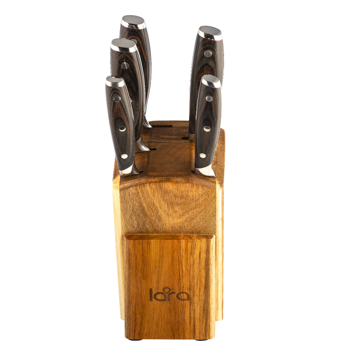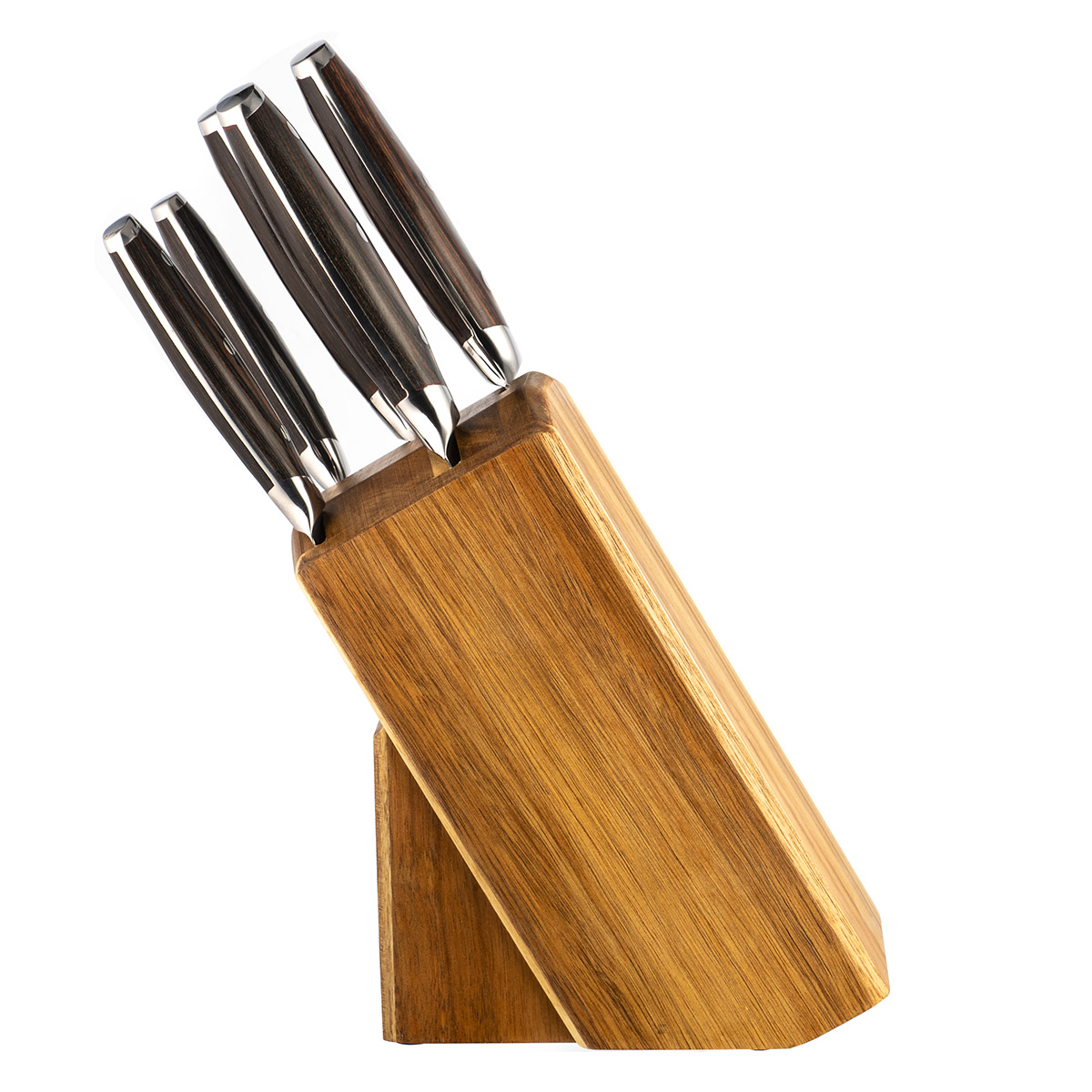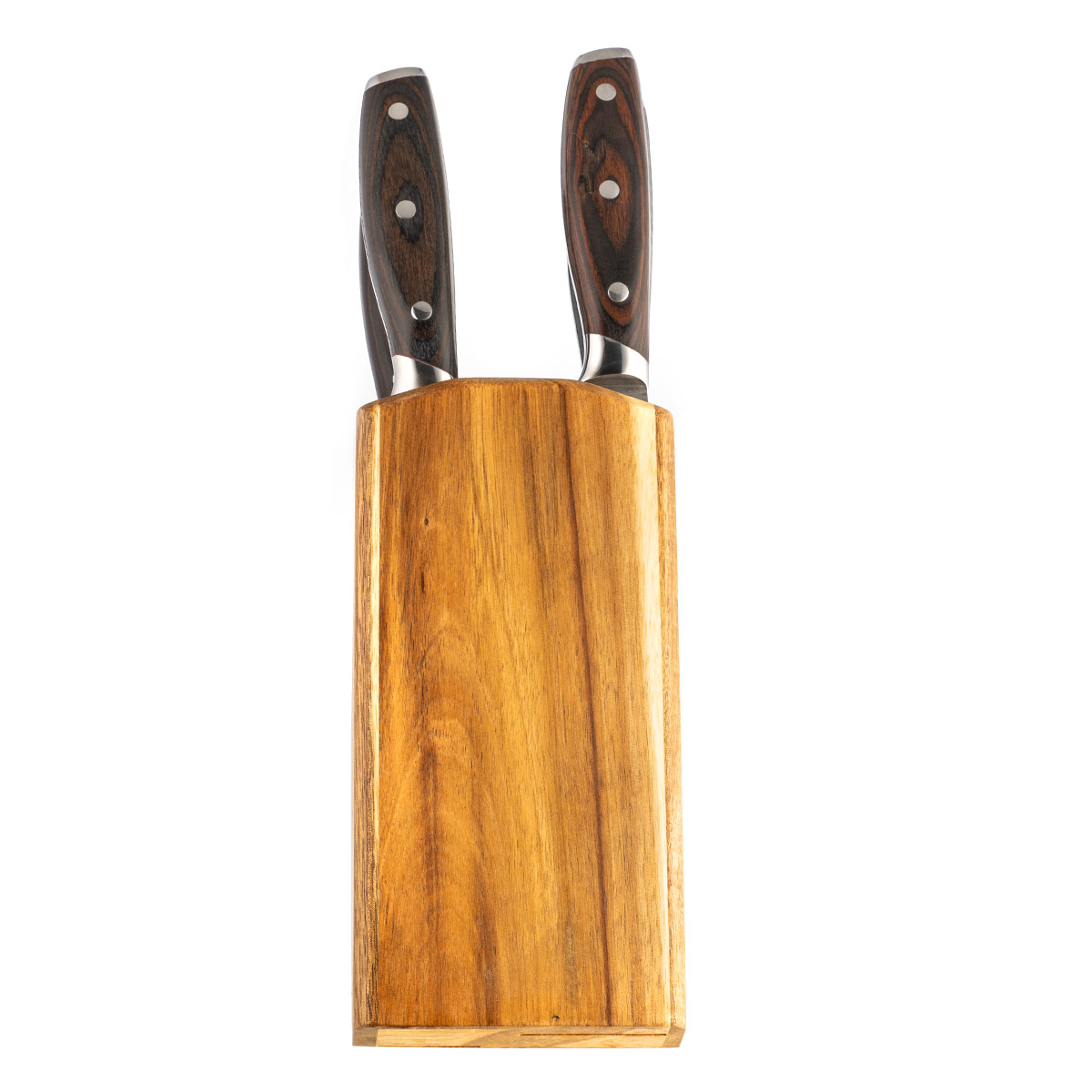 Устойчивая подставка из массива акации бережно сохранит заточку ножей и обеспечит компактное хранение на кухне.