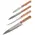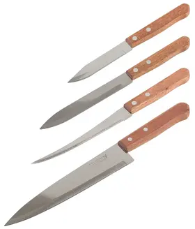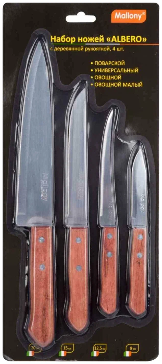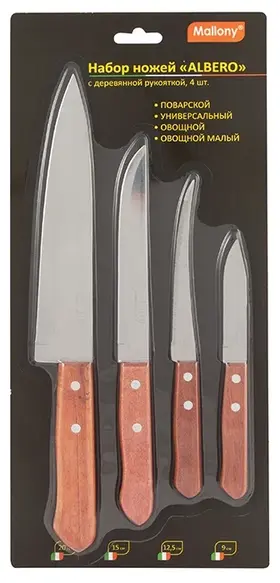 нож поварской (длина лезвия 20 см, толщина стали 1.2 мм), нож универсальный (длина лезвия 15 см, толщина стали 1 мм), нож овощной (длина лезвия 12.5 см, толщина стали 1 мм), нож овощной малый (длина лезвия 9 см, толщина стали 1 мм)