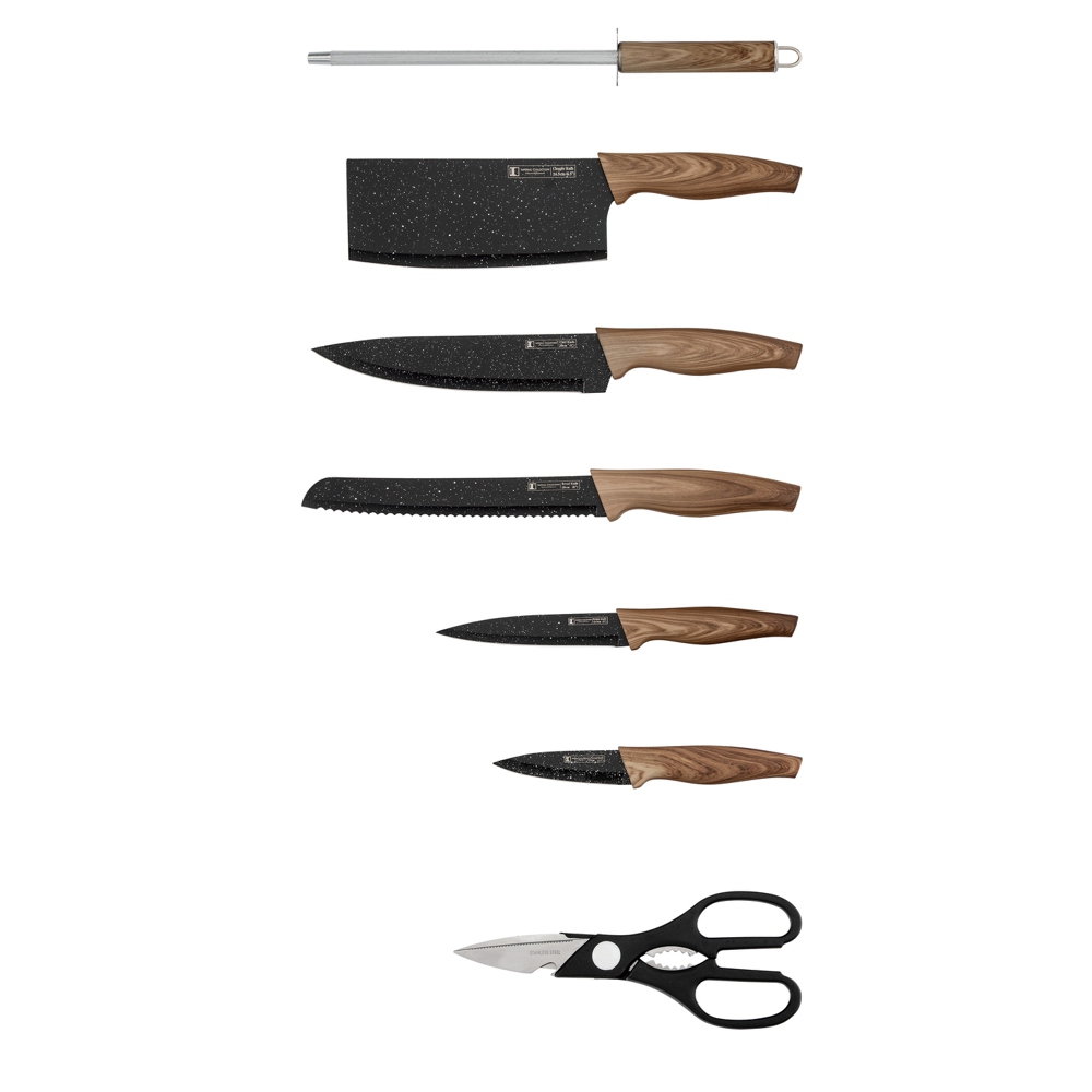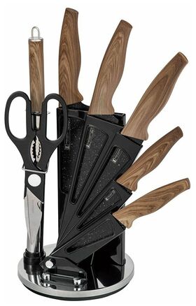Ножи выполнены из высококачественной нержавеющей стали. Антибактериальное покрытие. Удобная подставка вмещающая все ножи.