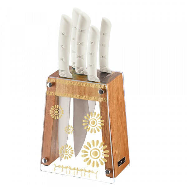 В наборе: поварской нож (20 см), нож для хлеба (20 см), нож для нарезки (20 см), универсальный нож (12.5 см), нож для чистки овощей (9 см), подставка для ножей.