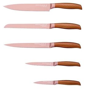 В наборе: поварской нож (20 см), нож для хлеба (20 см), нож для нарезки (20 см), универсальный нож (12.5 см), нож для чистки овощей (9 см), подставка для ножей. Габариты шт (см): 36,5х19,5х11 Кол-во в упак.: 6