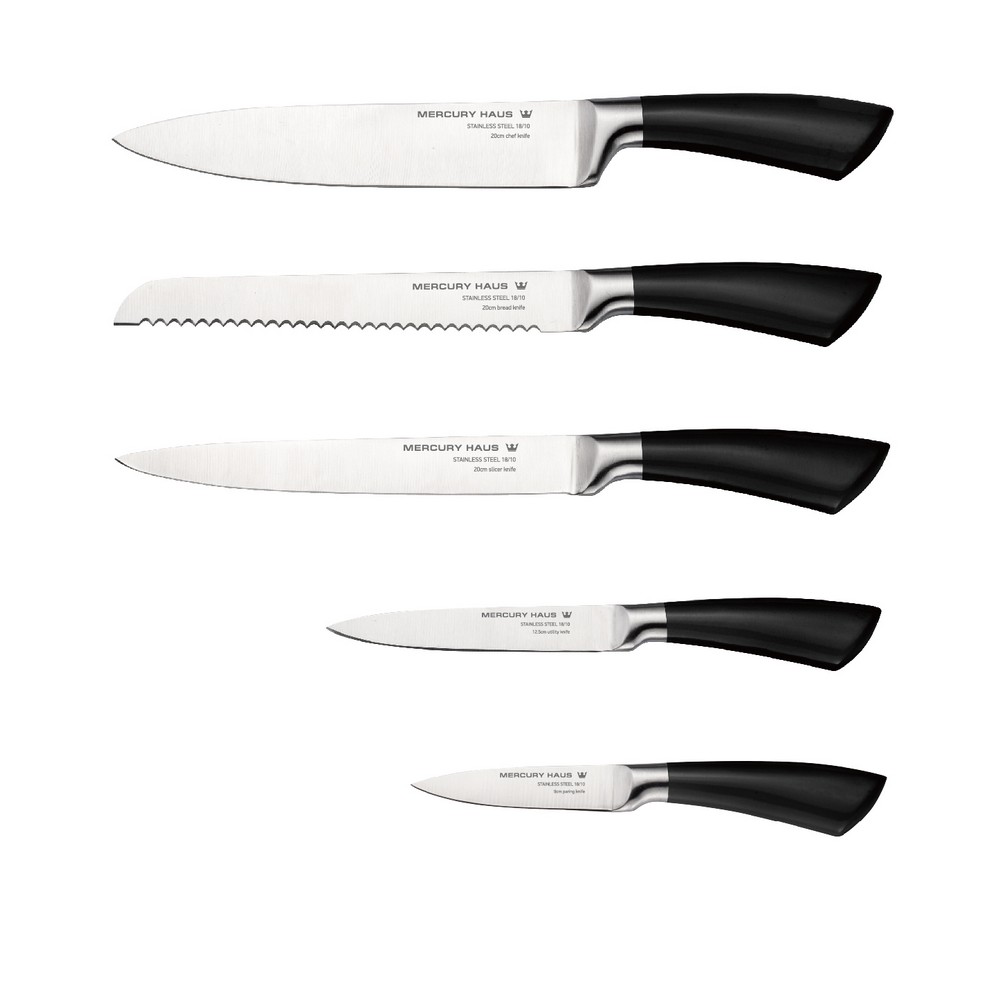 Комплектация поварской нож (20 см), нож для хлеба (20 см), нож для нарезки (20 см), универсальный нож (12.5 см), нож для чистки овощей (9 см), подставка для ножей
