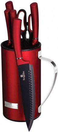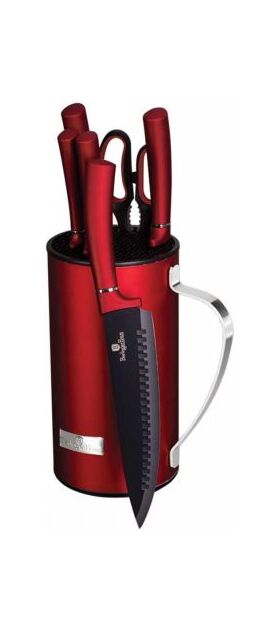 поварской нож 20 см; хлебный нож 20 см; нож для нарезки 20 см; универсальный нож 12,5 см; нож для чистки овощей 9 см; ножницы кухонные; подставка из нержавеющей стали.