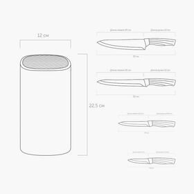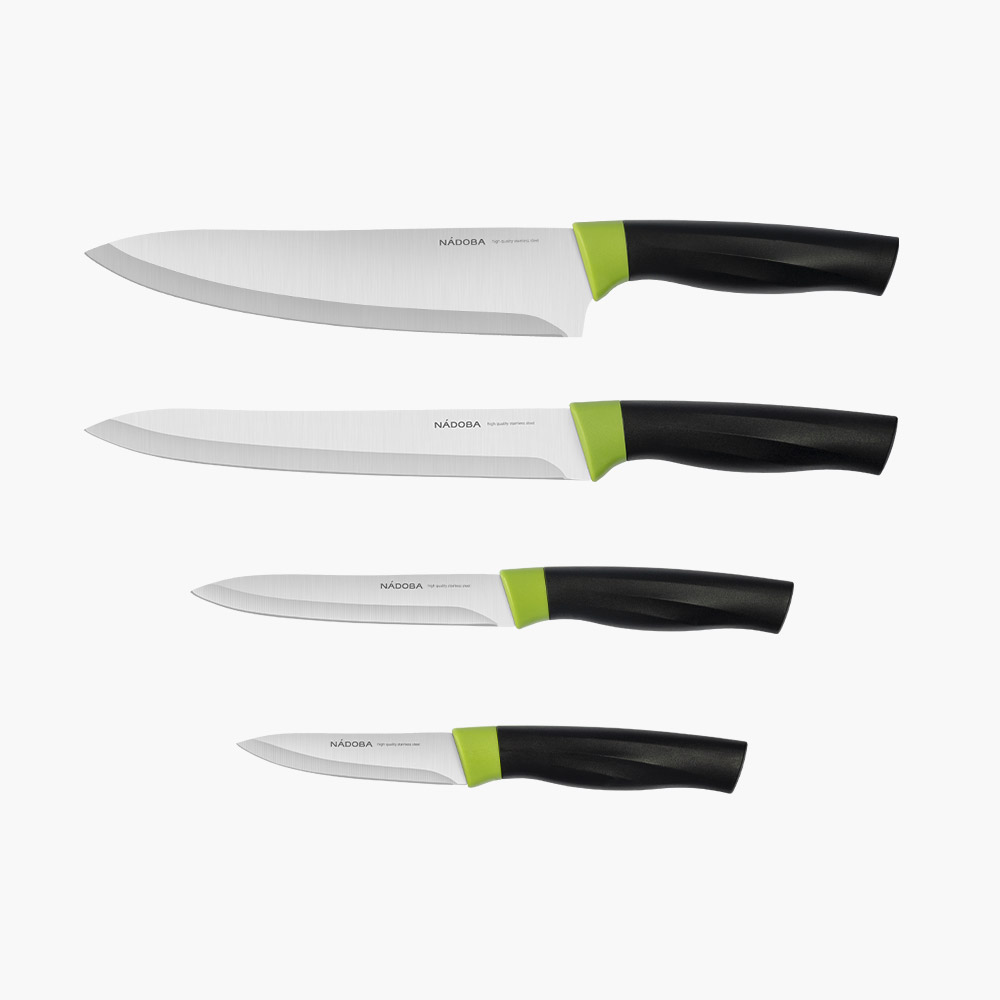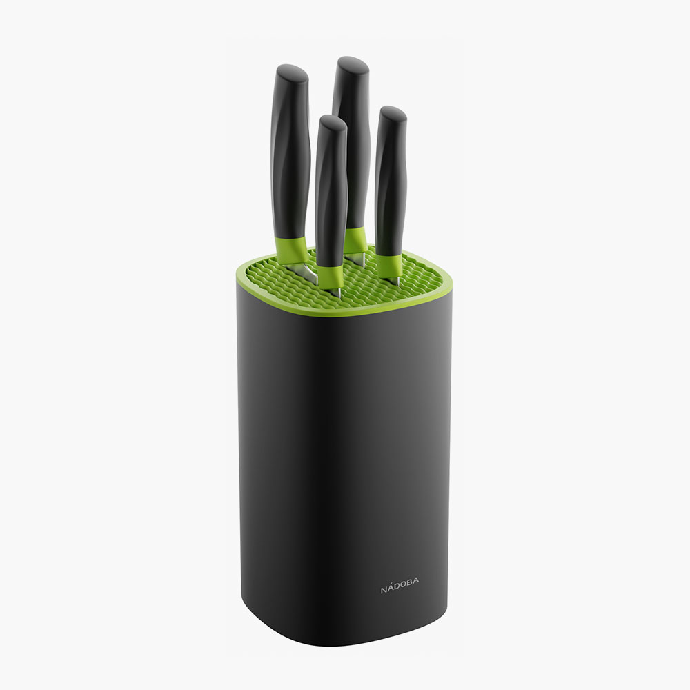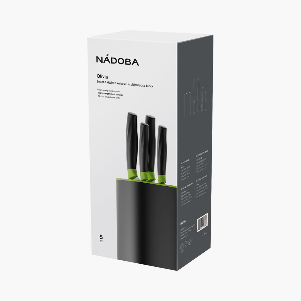Набор ножей 5 предметов NADOBA серии Olivia состоит из: нож овощной, 9 см, нож универсальный, 12,5 см, нож разделочный, 20 см, нож поварской, 20 см и универсального блока для хранения ножей. Ножи выполнены из высококачественной нержавеющей стали с высоким содержанием углерода. Блок нового поколения из высокопрочного пластика позволяет хранить ножи в любом количестве и произвольном порядке. Изделия можно мыть в посудомоечной машине.