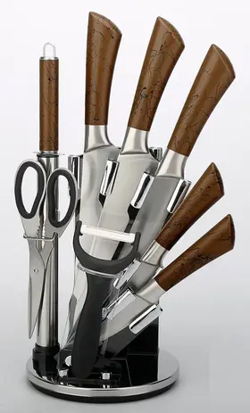 Аксессуары в наборе ножей: Кухонный топорик, Ножницы, Овощечистка, Подставка, Точилка для ножей