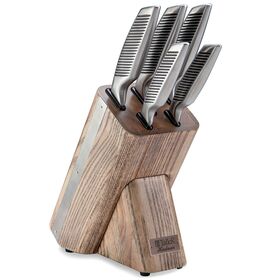 Ножи помогут вам справиться с различными задачами на кухне. В набор входят хлебный, овощной, поварской, разделочный и универсальный ножи. Кроме того, вы получите удобную деревянную подставку для их хранения.