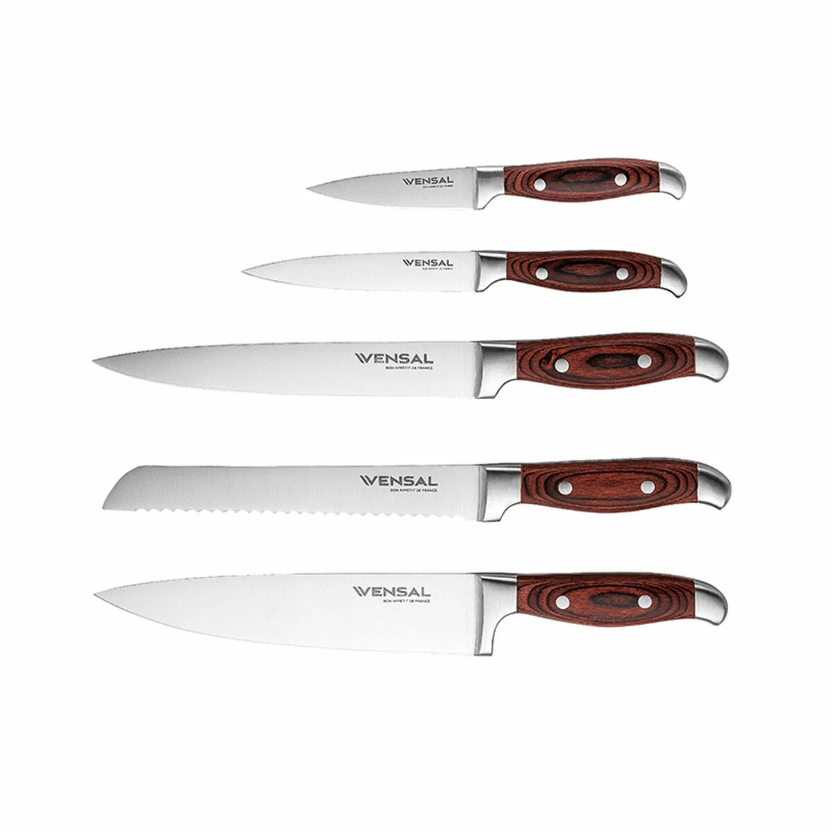Поварской нож 20 см, толщина лезвия 2,5 мм; Хлебный нож 20 см, толщина лезвия 2,5 мм; Разделочный нож 20 см, толщина лезвия 2,5 мм; Универсальный нож 12,7 см, толщина лезвия 2,0 мм; Нож для овощей 8,9 см, толщина лезвия 2,0 мм; Материал клинка легированная нержавеющая сталь 3Cr13. Твердость по шкале Роквелла 52-54 HRC. Материал рукоятки нержавеющая сталь и прессованная древесина. Двухклепочное крепление рукоятки. Пятка европейского типа. Подставка изготовлена из каучукового дерева. Подставка с нескользящими ножками. Нельзя мыть в посудомоечной машине