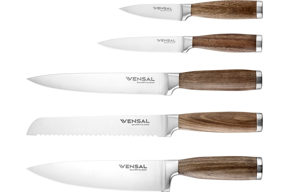 Поварской нож 20 см, толщина лезвия 2,5 мм Хлебный нож 20 см, толщина лезвия 2,5 мм Разделочный нож 20 см, толщина лезвия 2,5 мм Универсальный нож 12,7 см, толщина лезвия 2,0 мм Нож для овощей 8,9 см, толщина лезвия 2,0 мм. Материал клинка легированная нержавеющая сталь 3Cr13. Твердость по шкале Роквелла 52-54 HRC. Материал рукоятки нержавеющая сталь и ореховое дерево. Кованая рукоятка. Пятка европейского типа. Подставка изготовлена из каучукового дерева. Подставка с нескользящими ножками. Нельзя мыть в посудомоечной машине.