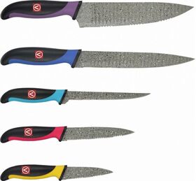 Набор кухонных ножей и элегантная подставка для хранения ножей. Острая режущая кромка (3 ножа с серрейторной заточкой, 2 ножа с прямым лезвием) Удобные пластиковые рукоятки со вставками, предотвращающими скольжение.
