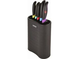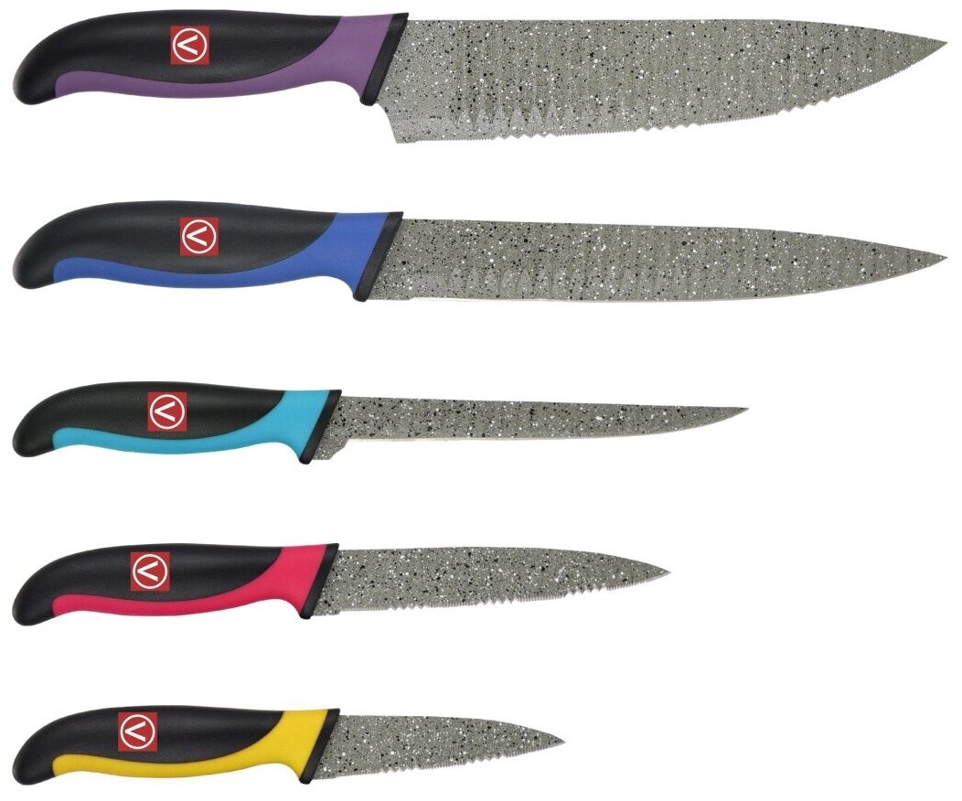 - нож для овощей 9 см;- нож универсальный 12,5 см;- нож для мяса 14 см;- нож разделочный 20 см;- нож поварской 20 см;- подставка.