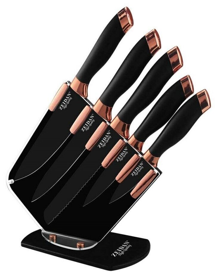 Нож поварской – 20 см/1,5 мм, Нож разделочный – 20 см/1,5 мм, Нож для хлеба – 20 см/1,5 мм, Нож универсальный –13 см/1,2 мм, Нож для овощей – 9 см/1,2 мм