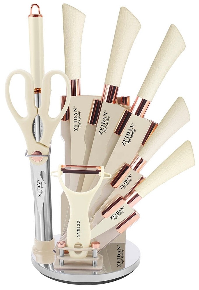 Нож-топорик, поварской нож, нож разделочный, универсальный нож, нож для овощей, мусат, ножницы, овощечистка, складная подставка из акрила, подарочная упаковка c пластиковой ручкой.