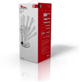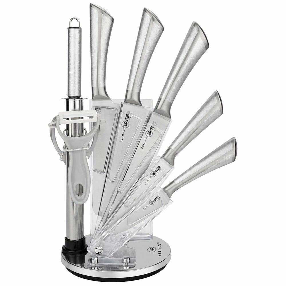 Аксессуары в наборе ножей: Подставка, Кухонный топорик, Точилка для ножей, Ножницы, Овощечистка