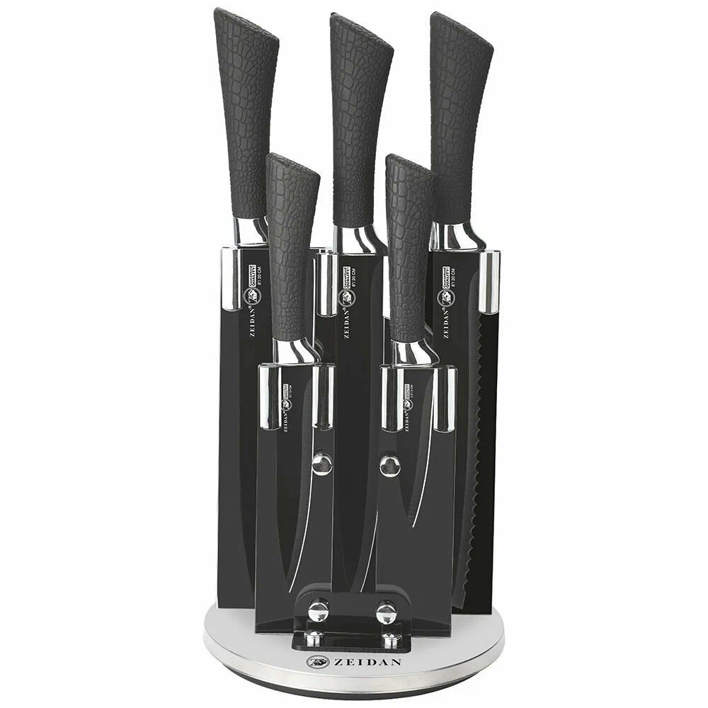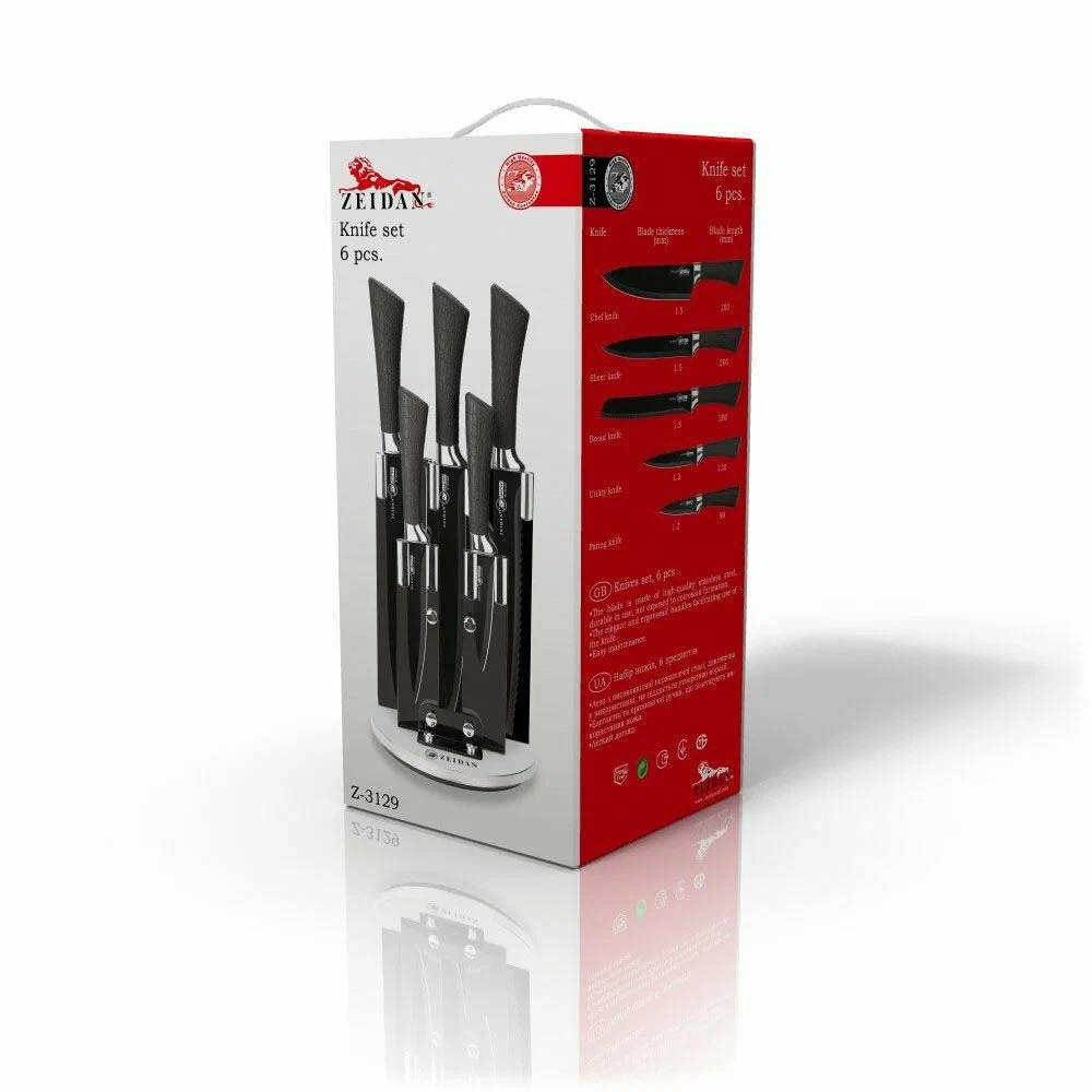 нож поварской - 1,5mm/8", нож разделочный -1,5mm/8", нож для хлеба - 1,5mm/8", нож универсальный - 1,2mm/5", нож для овощей – 1,2mm/3,5, подставка
