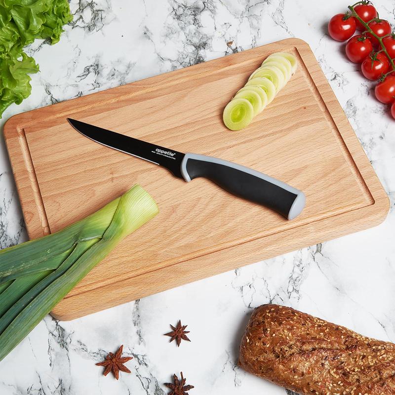Такой нож предназначен для нарезки овощей, фруктов, сыра, небольших буханок, хлеба, булочек, масла и других продуктов. Лезвия долгое время остаются острыми и не требуют частого затачивания. Этот прибор предназначен для резки продуктов с минимальным усилием, по этой причине его нужно использовать с осторожностью.