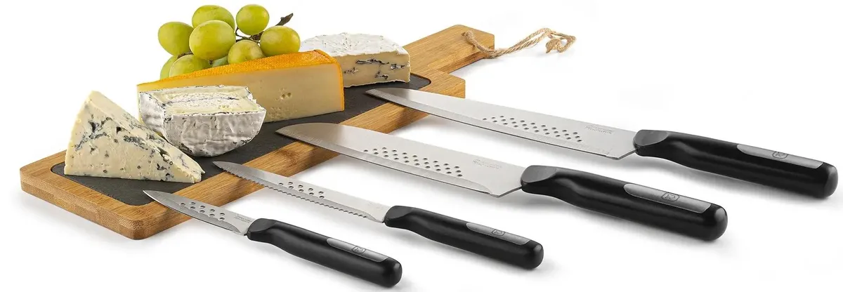 Материал клинка: высококачественная нержавеющая сталь X30Cr14. Материал рукоятки: комбинированная: ударопрочный пластик и нержавеющая сталь. Преимущества: лезвия ножей с эффектом anti-stick - продукты не прилипают к лезвию в процессе их нарезки. Использование: не подходит для посудомоечной машины.