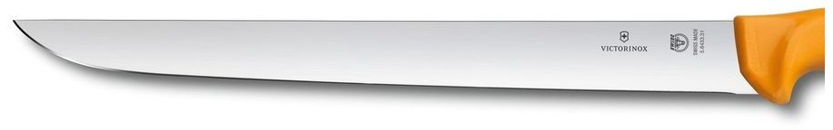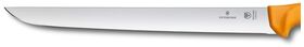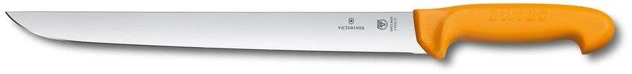 Длинный мясницкий нож с прямым обухом. Большая длина ножа позволяет легко и быстро нарезать куски стейков или нарубить достаточное количество котлетной массы.
