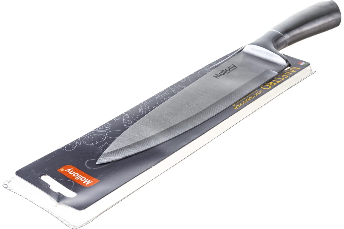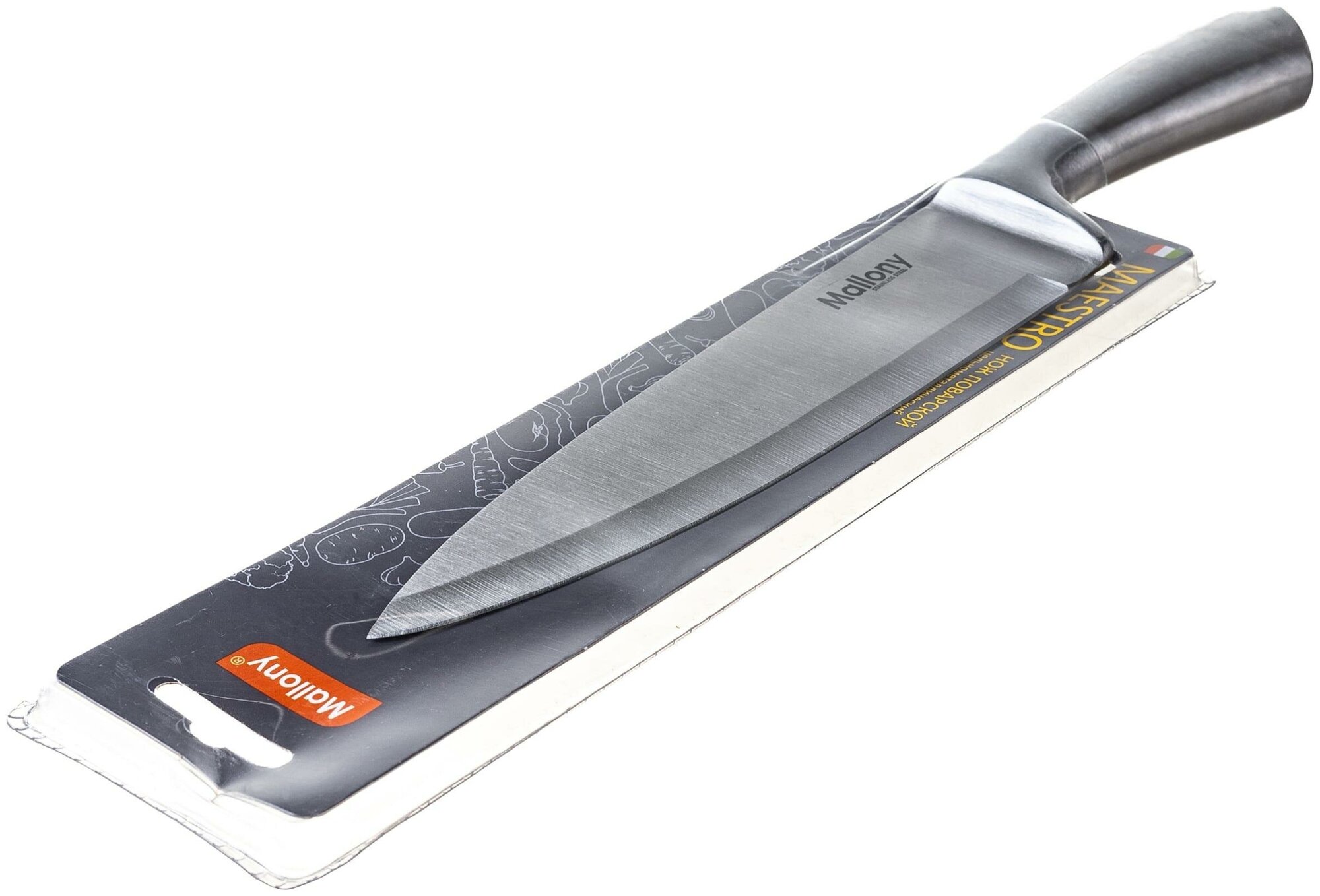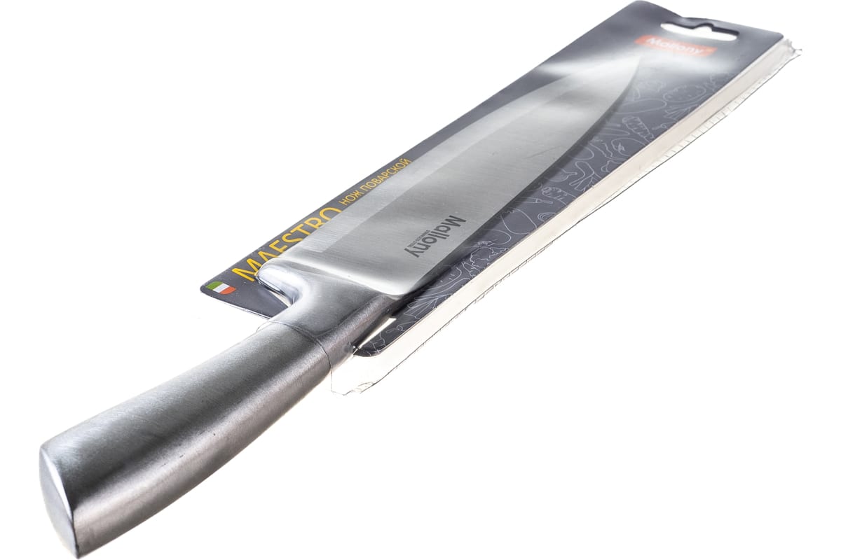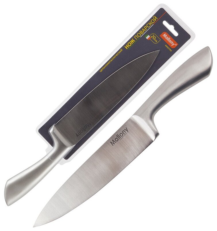 Цельнометаллический нож поварской, 20 см, изготовлен из прочной стали. Толщина клинка составляет 2 мм.