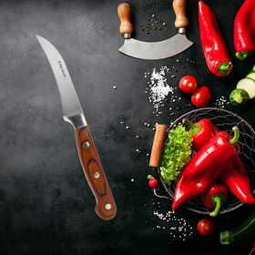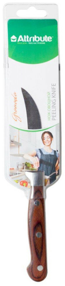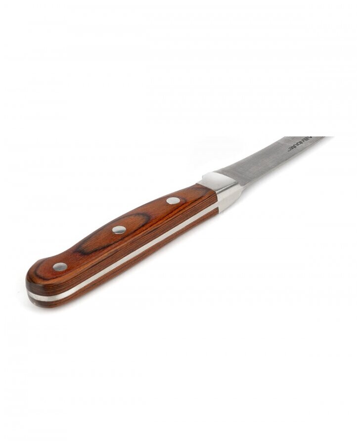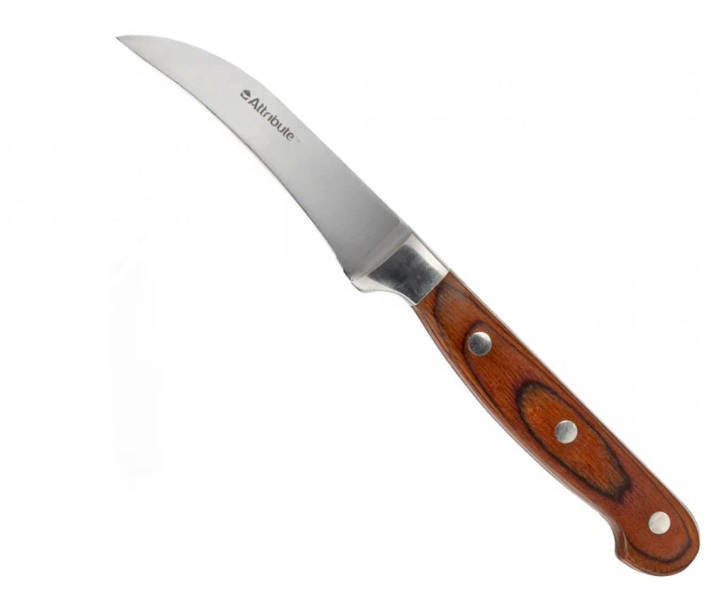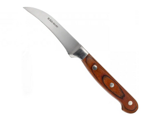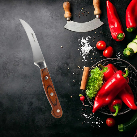 Нож для овощей предназначен специально для чистки и нарезки овощей. Лезвие ножа выполено крюкообразной формой и изготовлено из экологически чистой нержавеющей стали. Особая заточка лезвия позволяет быстро очищать овощи от кожуры. Ручка ножа сделана из красного дерева, которое укреплено фиксирующими вставками из нержавеющей стали.