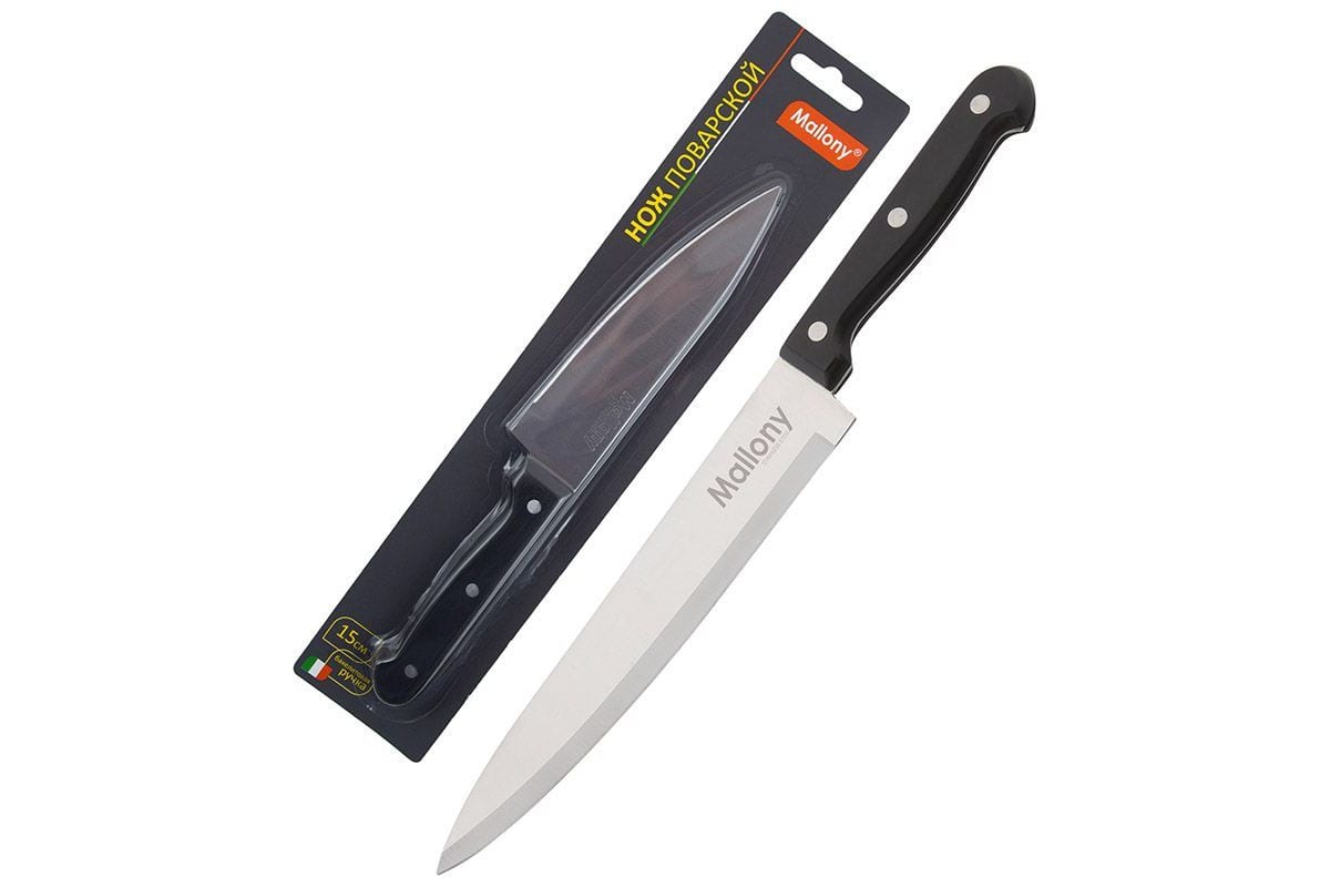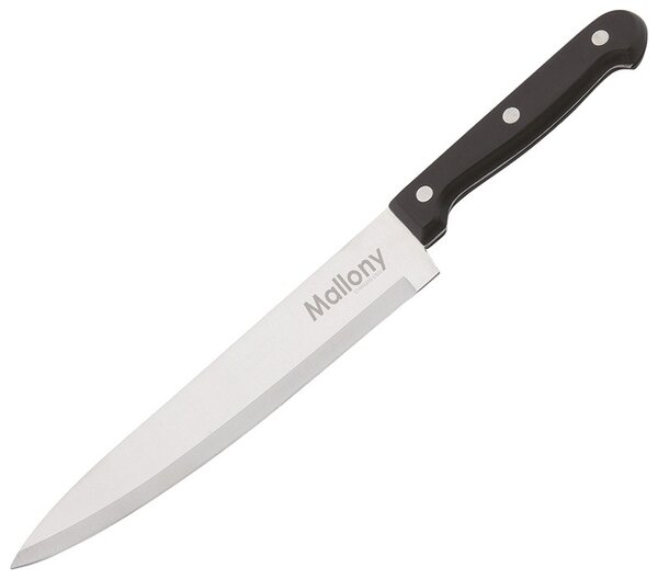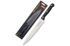 Нож с бакелитовой рукояткой подойдет для эксплуатации в быту, на кухне, а также в профессиональных целях - в местах общественного питания, ресторанах, кафе. Нож изготовлен из прочной стали. Толщина клинка составляет 1.5 мм. Нож имеет стильный дизайн.