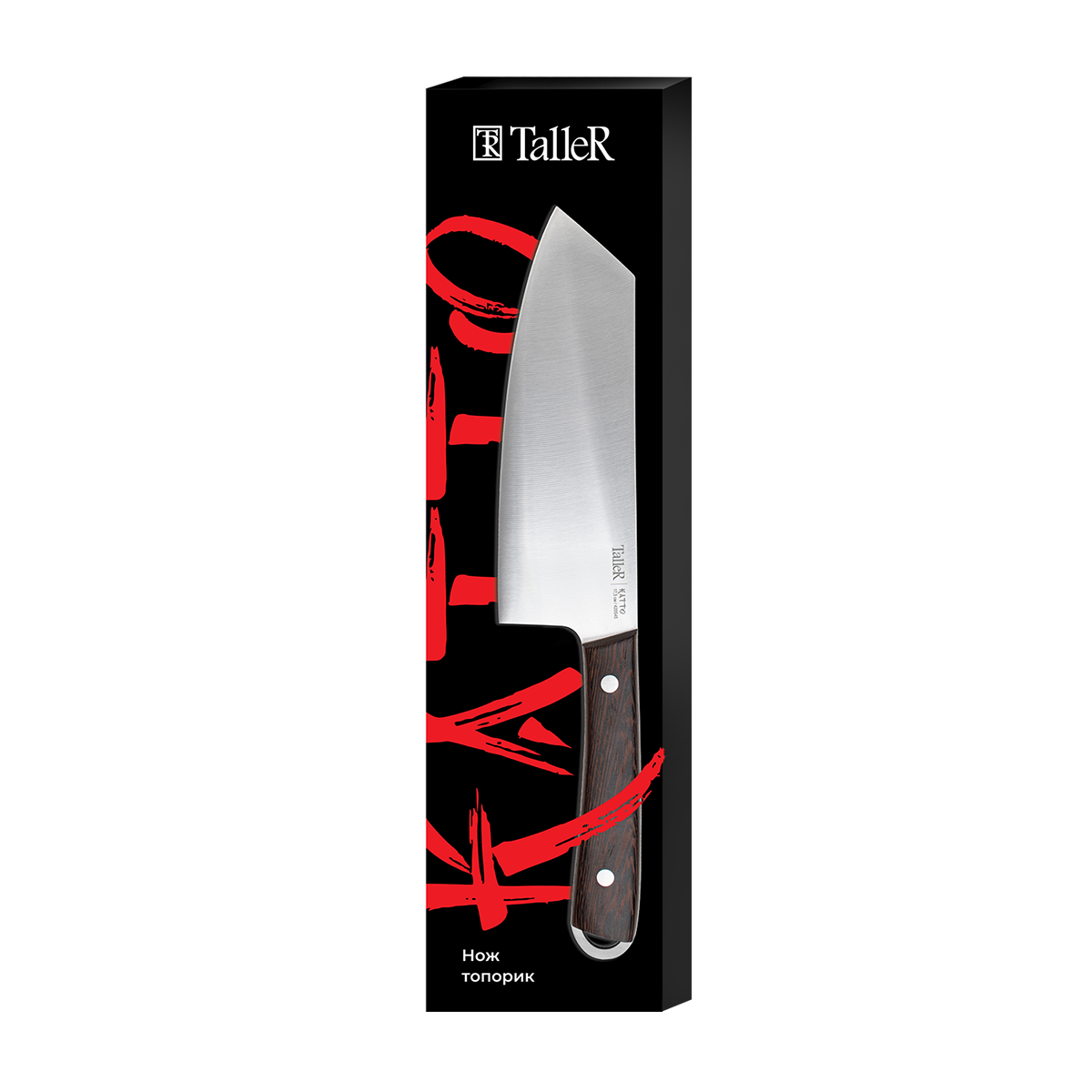 Нож топорик от бренда TalleR - это высококачественный инструмент для резки мяса, рыбы, овощей и фруктов. Он имеет длину лезвия 17,5 см и оснащен петлей для подвешивания, что делает его удобным в использовании на кухне.