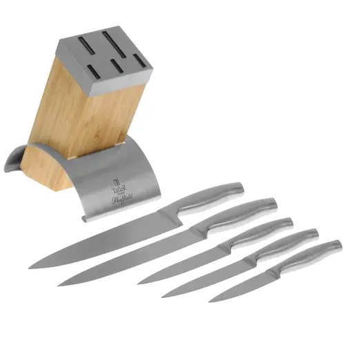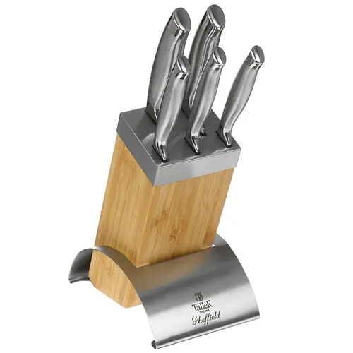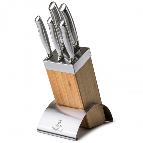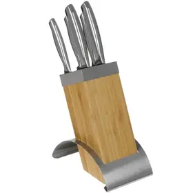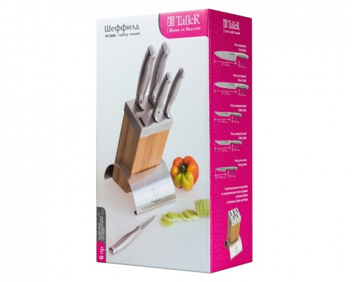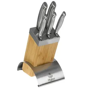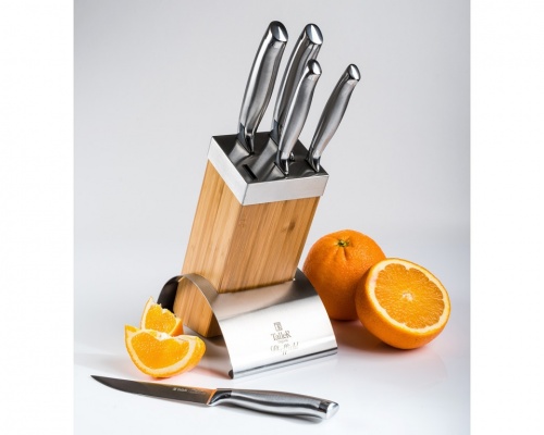 Набор оснащен красивой подставкой из каучукового дерева. Ножи из прочной нержавеющей стали долго не теряют остроту заточки и не вызывают сложностей в уходе. Литые ручки легко удерживаются и не теряют красоты через несколько лет.