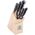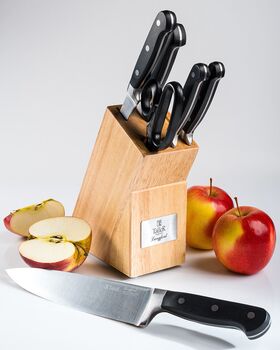 Пять ножей и ножницы, помещённые в удобную и стильную подставку, выполненную из каучукового дерева. В ней кухонные инструменты всегда будут в свободном доступе.