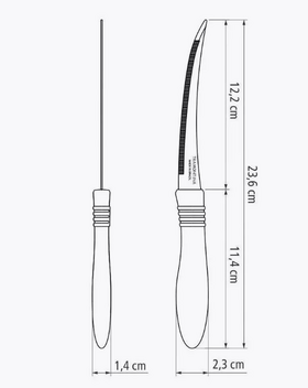Лезвие ножа нержавеющая сталь AISI 420, длинное неширокое с микрозубчиками, что бы легко разрезать плотную кожицу, не помяв мягкой сердцевины. Толщина 1-1,5 мм., есть 3 насечки около лезвия для безопасности пользователя.