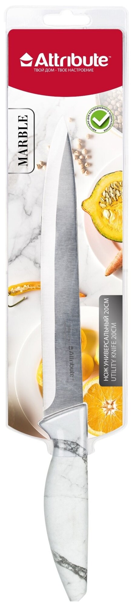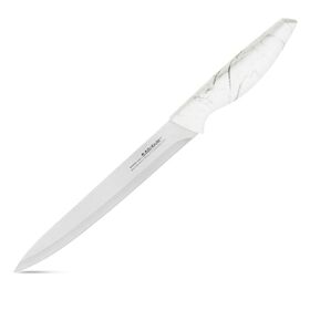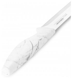 Универсальный нож отлично подойдет для ежедневного использования. Нож предназначен для нарезки всех типов продуктов, он идеально шинкует, нарезает и измельчает продукты. Лезвие выполнено из высококачественной нержавеющей стали. Благодаря уникальной формуле стали и качеству ее обработки, лезвие имеет высокий показатель твердости, что позволяет ножу долго сохранять острую заточку, а также повторно его затачивать. Эргономичная ручка ножа изготовлена из высококачественного пластика, а рисунок ручки имитирует текстуру мрамора и его вид.