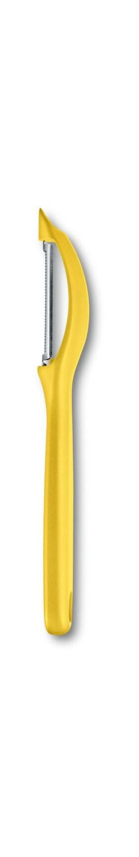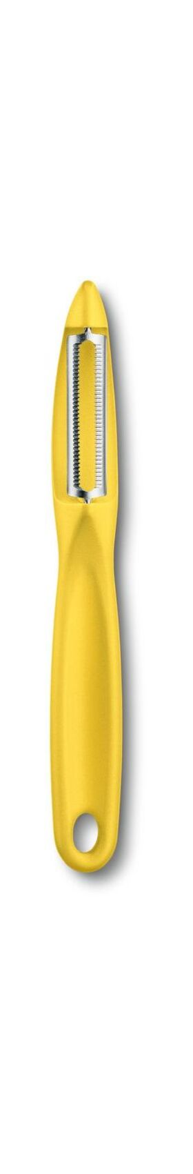 Универсальная овощечистка с эргономичной ручкой красного цвета и зазубренным краем лезвия, что позволяет легко снимать кожуру, а острый наконечник с легкостью удалит глазки с картофеля.