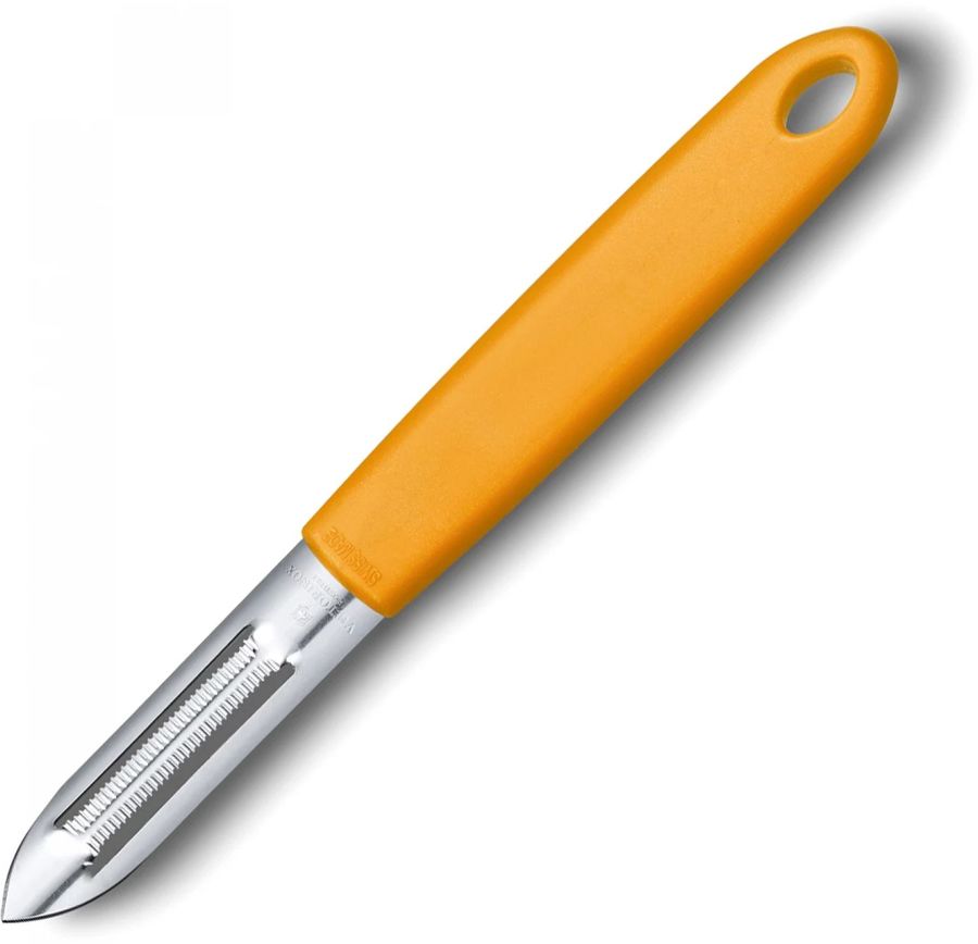 Лезвие на овощечистке обладает двусторонней заточкой (для правшей и левшей ) и закреплено неподвижно. Кончик имеет заострение для удаления глазков на картофеле.