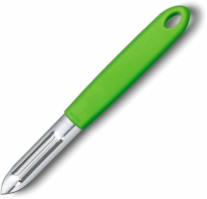 Лезвие на овощечистке обладает двусторонней заточкой (для правшей и левшей ) и закреплено неподвижно. Кончик имеет заострение для удаления глазков на картофеле.