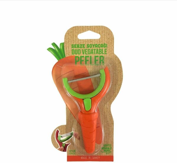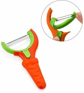 Овощечистка с подвижной головкой, которую можно использовать как по вертикальной, так и по горизонтальной оси. Вы можете вращать наконечник, нажимая среднюю кнопку. Имеет эргономичный дизайн. Подходит для мытья в посудомоечной машине.