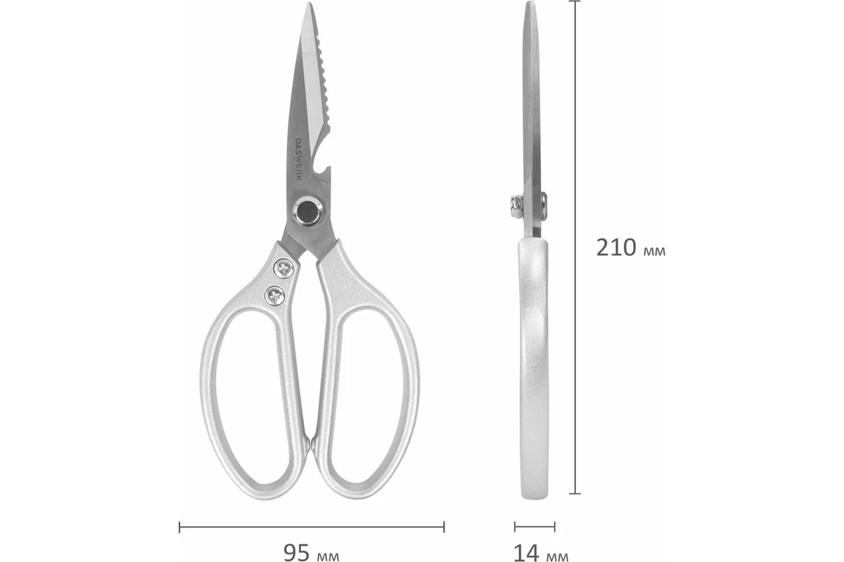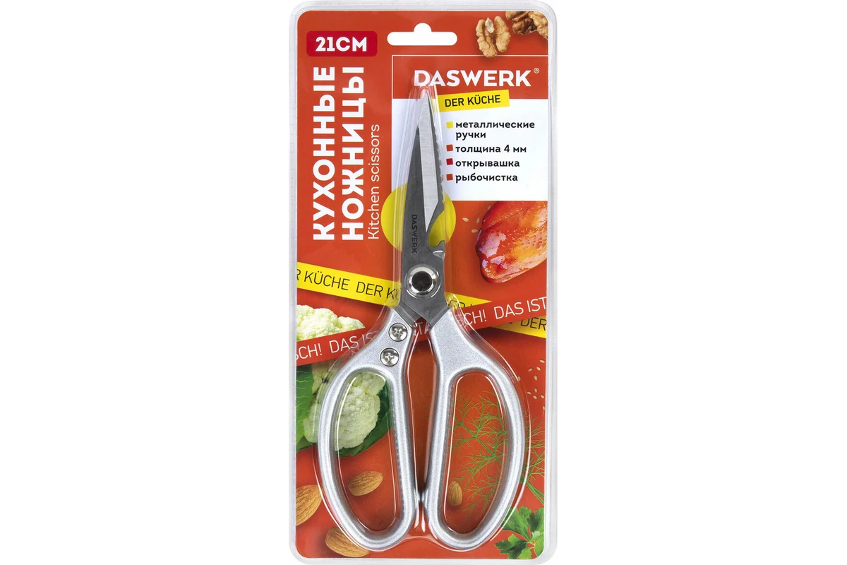 Эти кухонные ножницы являются важной частью кухонной утвари и посуды для кухни, обеспечивая надежность и многофункциональность. Независимо от задач, будь то приготовление пищи или уход за растениями, ножницы DASWERK станут незаменимыми кухонными аксессуарами в вашем доме.