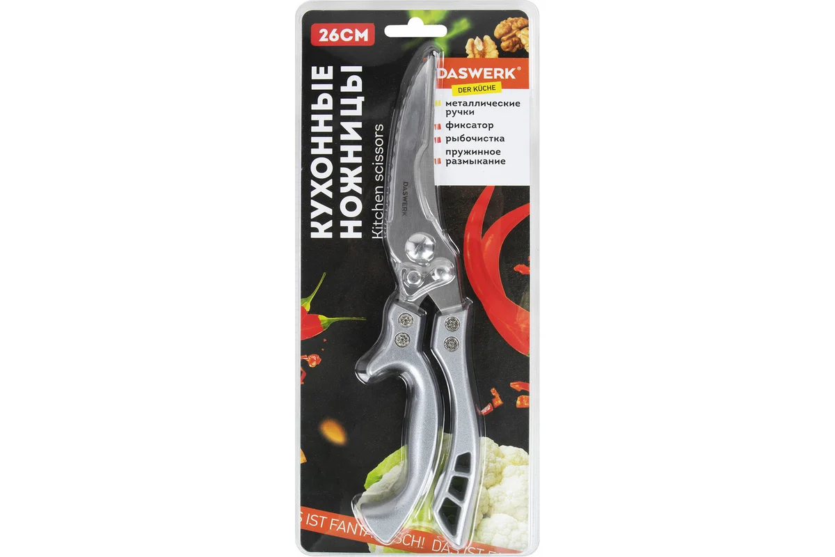 Общая длина — 260 мм, что делает их удобными и практичными для повседневного использования. Ножницы-секатор DASWERK — это идеальная посуда для кухни и незаменимое дополнение к вашей кухонной утвари.