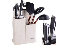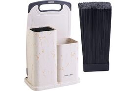 Универсальная подставка позволит хранить ножи и ножницы любой формы, вне зависимости от их формы и лезвия. Корпус подставки выполнен из пластика, что делает её гигиеничной и долговечной, покрыт нескользящим слоем soft-touch. Уникальный внутренний наполнитель состоит из тонких и гибких полипропиленовых стержней, которые легко моются. При необходимости наполнитель свободно вынимается и моется в посудомоечной машине. Полипропилен является экологически чистым материалом, устойчивым к истиранию, высокой температуре и химическому воздействию.Имеет два отсека: для ножей и столовых приборов, а так же в наборе разделочная доска. Подставка для ножей станет прекрасным подарком, а ее яркий дизайн станет украшением Вашей кухни.