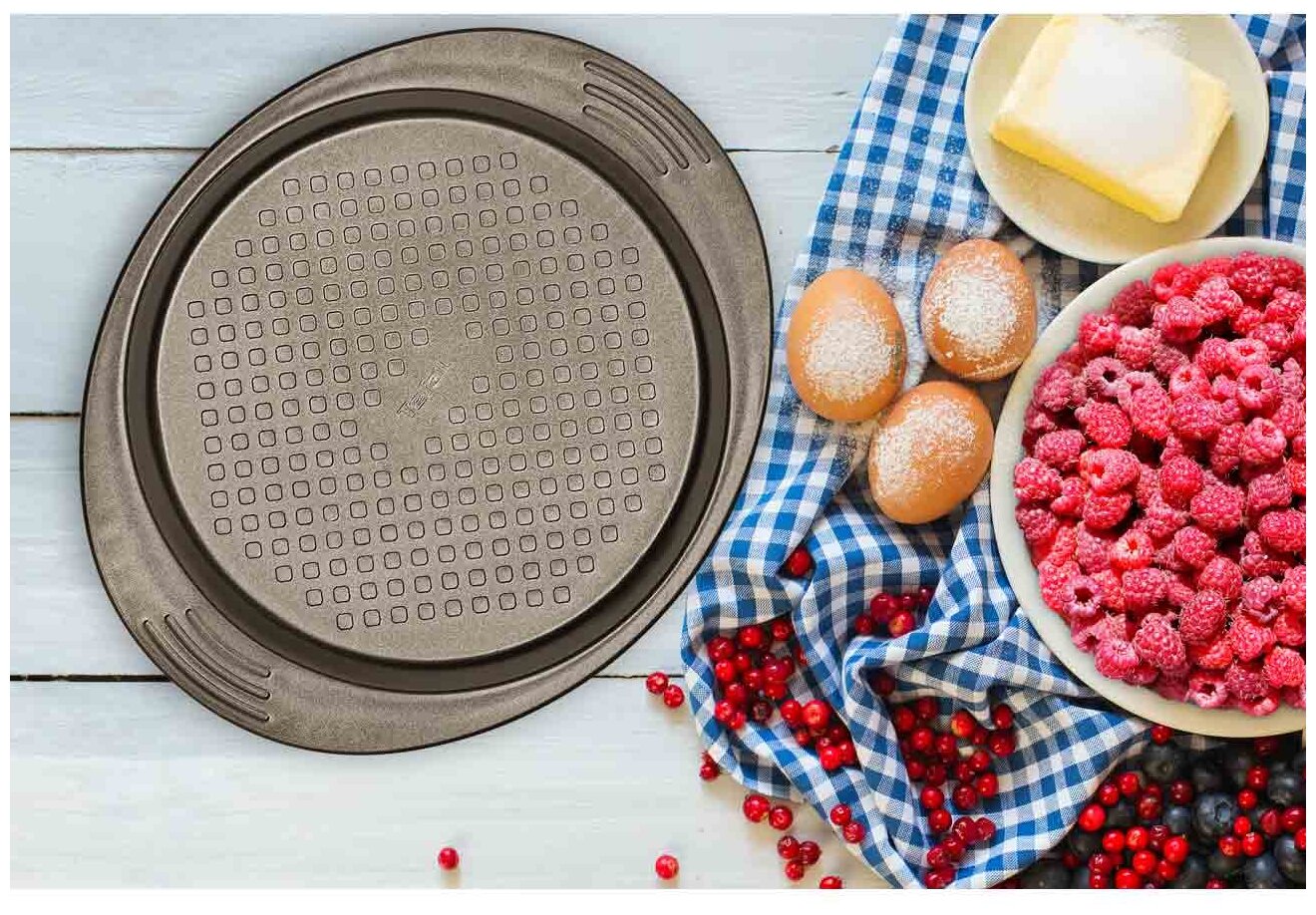 Большие удобные ручки. Антипригарное покрытие и текстурированное дно позволяют легко извлекать выпечку. Легко чистить после использованияФорма