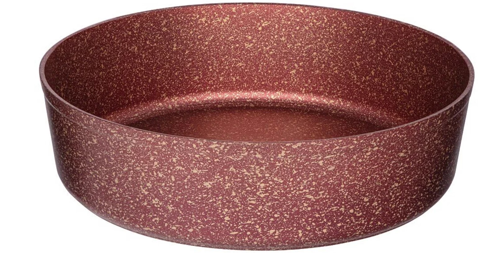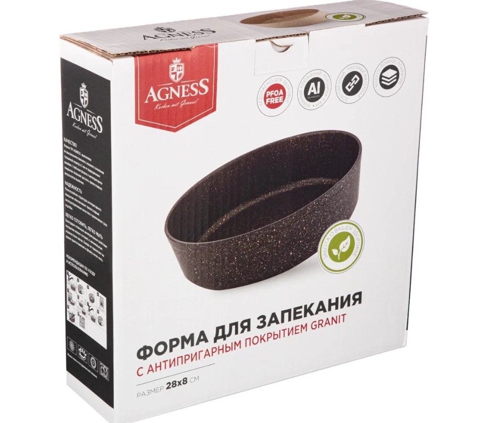 ТМ AGNESS представляет линейку посуды из утолщенного кованого алюминия премиального качества.\nКованый корпус формы для запекания толщиной 3 ММ выполнен из высококачественного алюминия, который обеспечивает высокую теплопроводность и сокращает время приготовления.\nвысокий борт 8 СМ позволяет получить пышную выпечку или потушить блюдо большего объема.\nдолговечное, прочное, трехслойное антипригарное покрытие на 100% безопасно, так как не содержит перфтороктановую кислоту (PFOA FREE)\nБлагодаря такому пкрытию блюдо не пристает к форме и легко извлекается после готовности.\nКоллекционный дизайн серии "RED QUEEN" - роскошный и практичный одновременно\nМожно мыть в посудомоечной машине\nТM AGNESS - готовьте С удовольствием
