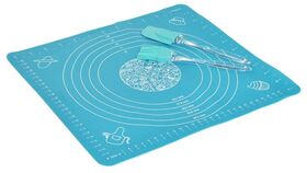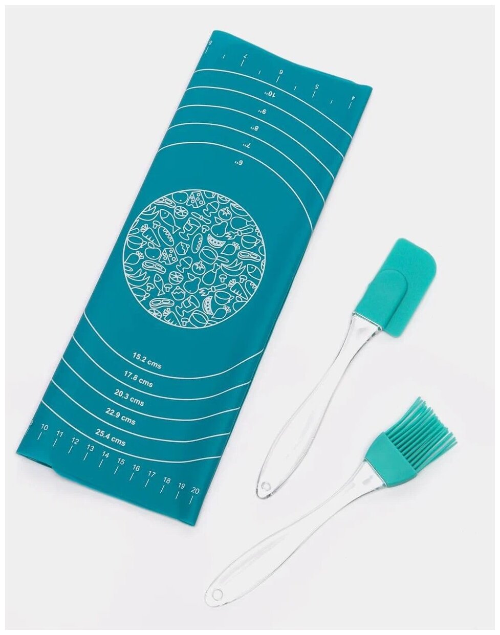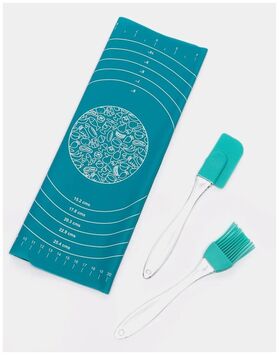 3 предмета: - кисточка (18*3 см), 13 гр- лопатка (17*3 см), 15 гр- коврик для раскатки теста однотонный, с разметкой (30*33 см, толщина 0,6 мм), 85 гр. Лопатка гибкая предназначена для равномерного распределения крема, масла, соуса или начинки. Кисточка предназначена для смазывания поверхностей посуды, а также продуктов перед запеканием или жаркой. Температура использования от -60°С до +260°С