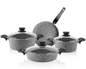 Набор посуды из 7 предметов с антипригарным покрытием – идеально подходит для приготовления пищи и различных блюд. Они обеспечивает равномерное распределение тепла благодаря своему толстому дну, что позволяет блюдам готовиться быстро. Комплект позволяет приготовить различные блюда: кашу, плов, спагетти или другие блюда. Ручка на кастрюльке выполнена таким образом, чтобы обеспечить надежный захват и комфортное использование. Каменная посуда подходит для газовых и электрических плит, а ее огнеупорное антипригарное покрытие облегчает уход за ней и позволяет готовить с минимальным количеством масла. Казан изготовлена из толстостенной гранитной отделки внутри и снаружи, которая защищает алюминиевый корпус от царапин, состав ручки - бакелит. Сковородка и сотейник с двойным дном обеспечивает дополнительную изоляцию и сохранение тепла, что позволяет экономить энергию при приготовлении пищи. Для длительного использования не рекомендуется мыть в посудомоечной машине. В набор входят: Кастрюля маленькая с крышкой - диаметр 20 см. объем 2,3 л., кастрюля большая с крышкой - диаметр 24 см. объем 3,3 л., сотейник с крышкой - диаметр 26 см. объем 3,9 л., сковорода без крышки - диаметр 26 см. объем 1,6 л. Производство Турция.