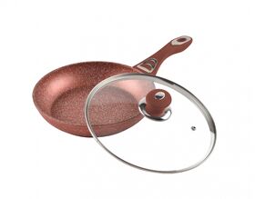 26см с крышкой, толщина стенки 2,5мм, дна 4,5мм, высота 4,5см. Внутри 3-х слойное мраморное антипригарное цветное покрытие с рельефом, снаружи 3-х слойное мраморное жаропрочное цветное покрытие. Ручка с силиконовым покрытием в цвет сковороды. Индукционное дно. Подходит для всех видов плит и чистки в посудомоечной машине. Состав: кованый алюминий.