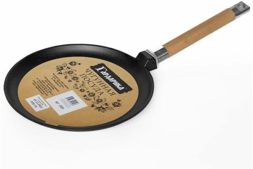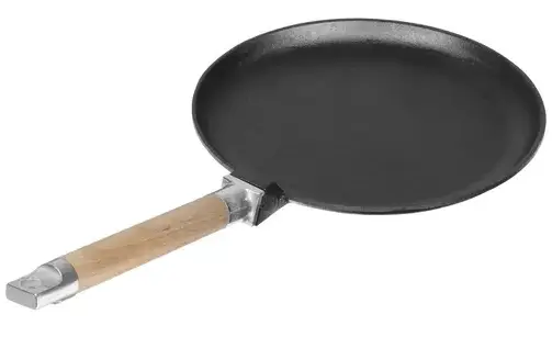 Сковорода-блинница поставляется вместе с удобной съемной ручкой из дерева. Поверхность остается прохладной, что уменьшает риск получения ожога от соприкосновения с горячей поверхностью. На конце есть отверстие для горизонтального подвешивания.