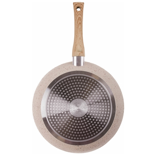 материал ручки: бакелит; диаметр ферромагнитной вставки - 17,3 см; эргономичная ручка с покрытием Soft Touch не нагревается и не скользит; внутреннее 4-х слойное антипригарное покрытие Pfluon; подходит для всех видов плит, включая индукционные