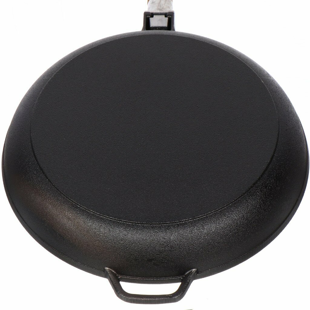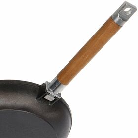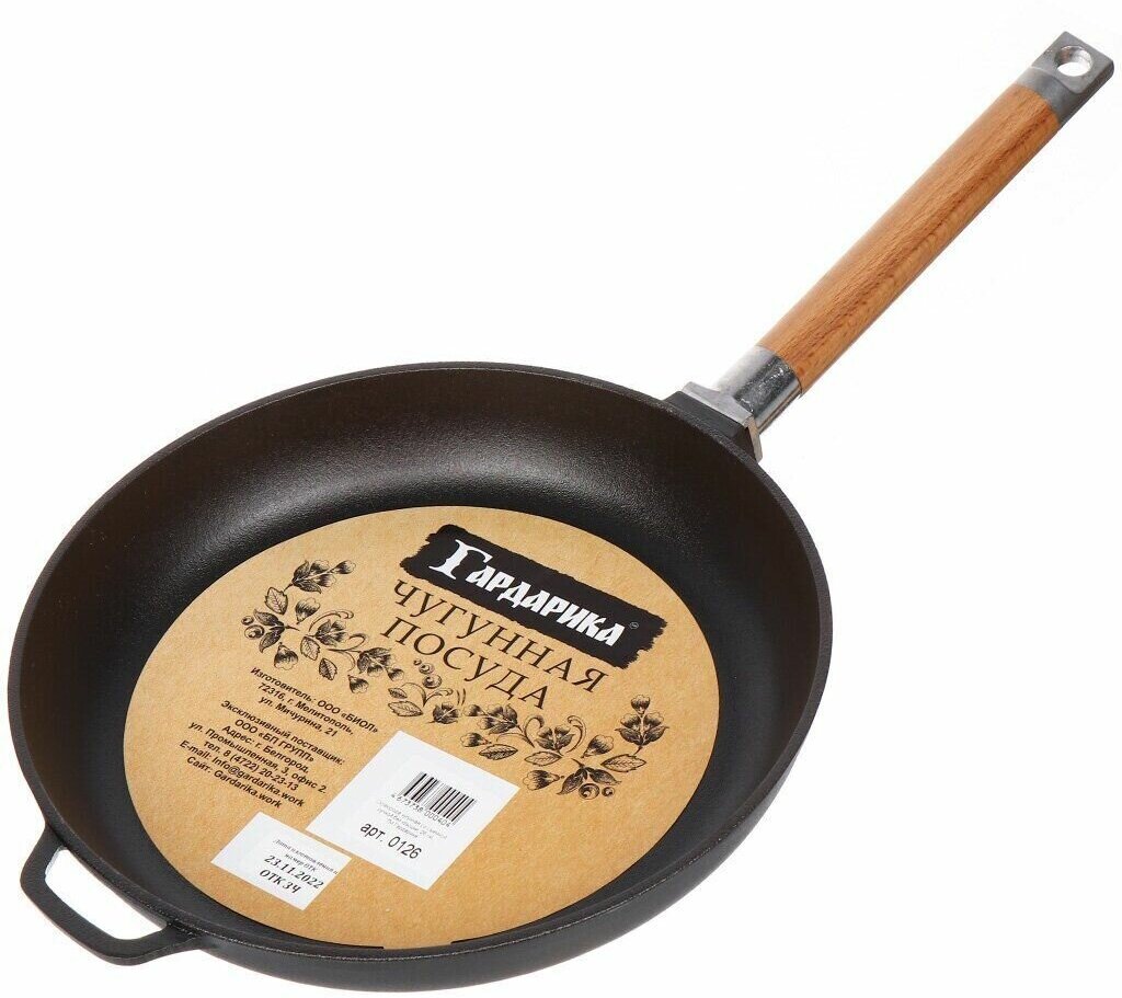 Cковорода Гардарика чугунная, съемная ручка, 26см. Надежная система крепления деревянной ручки позволяет использовать и без того тяжелую чугунную посуду не опасаясь, что ручка подведет в самый не подходящий момент. Кроме того, при условии снятой ручки посуду можно использовать в духовом шкафу или просто компактно ее хранить. В чугунных сковородах Гардарика ручка снимается путем раскручивания зажимного элемента встроенного в саму ручку. Такая Фиксация наиболее надежная, но она не самая удобная в плане присоединения и снятия ручки. Процесс занимает длительное время по сравнению с другими креплениями и может быть выполнен только при помощи двух рук с холодной сковородой. Посуду можно использовать в духовке. Материал посуды - чугун.
