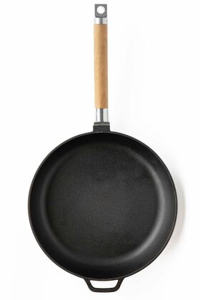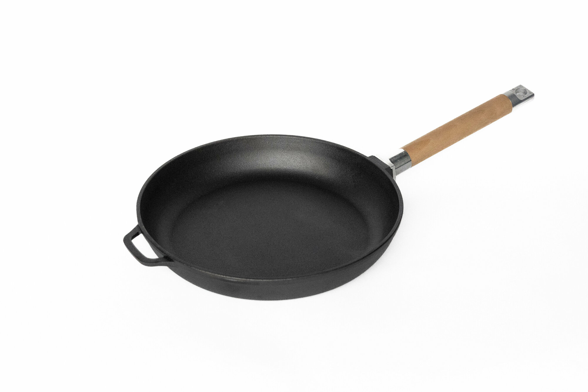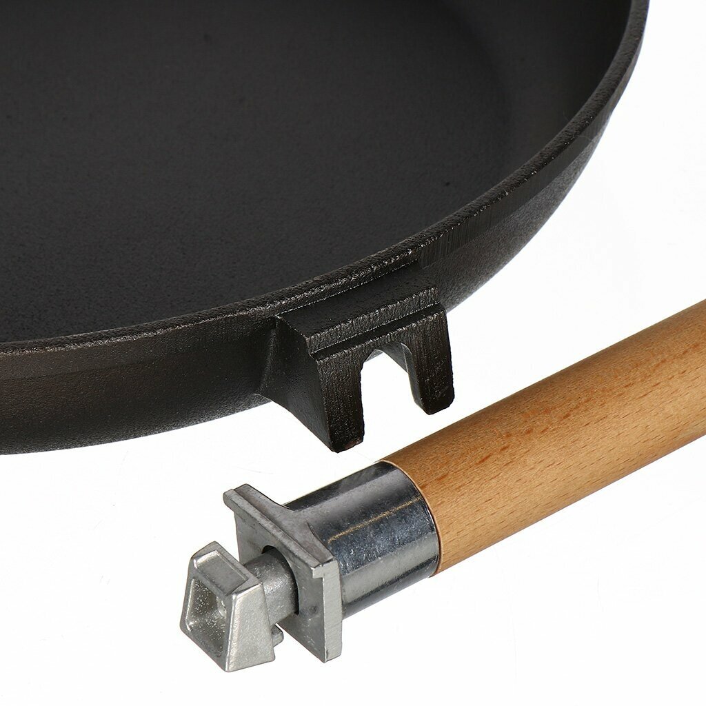 Надежная система крепления деревянной ручки позволяет использовать и без того тяжелую чугунную посуду не опасаясь, что ручка подведет в самый не подходящий момент. Кроме того, при условии снятой ручки посуду можно использовать в духовом шкафу или просто компактно ее хранить.